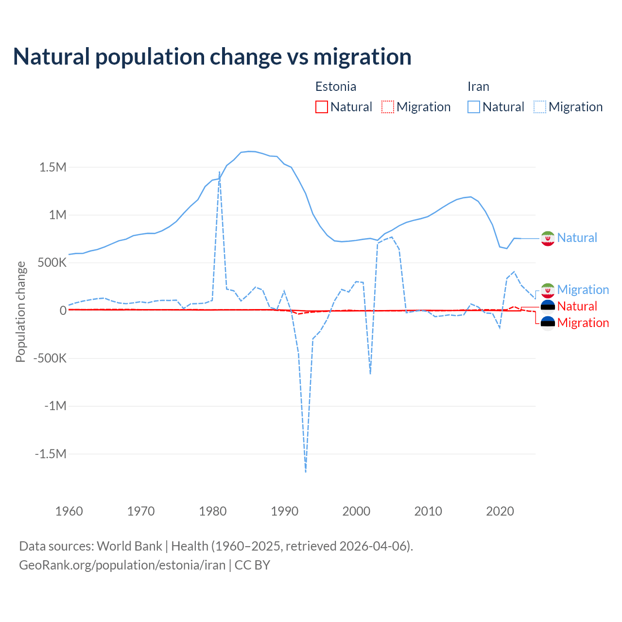 Over the last 10 years, 26.1% of the population change in Estonia is from natural causes (a loss of 27,683 people) and 73.9% is from migration (a gain of 78,553 people). In Iran 92.5% is from natural causes (a gain of 9,405,860 people) and 7.46% is from migration (a gain of 757,979 people).