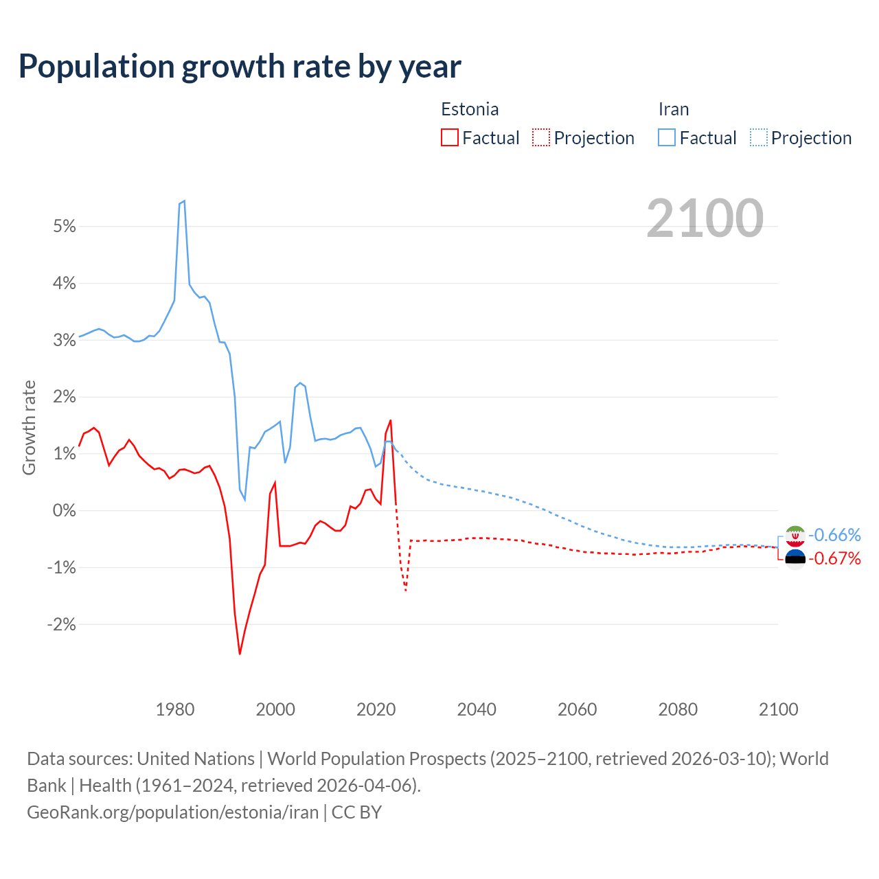 - For the last 10 years, Estonia has had an average growth rate of +0.37% per year vs +1.19% in Iran.