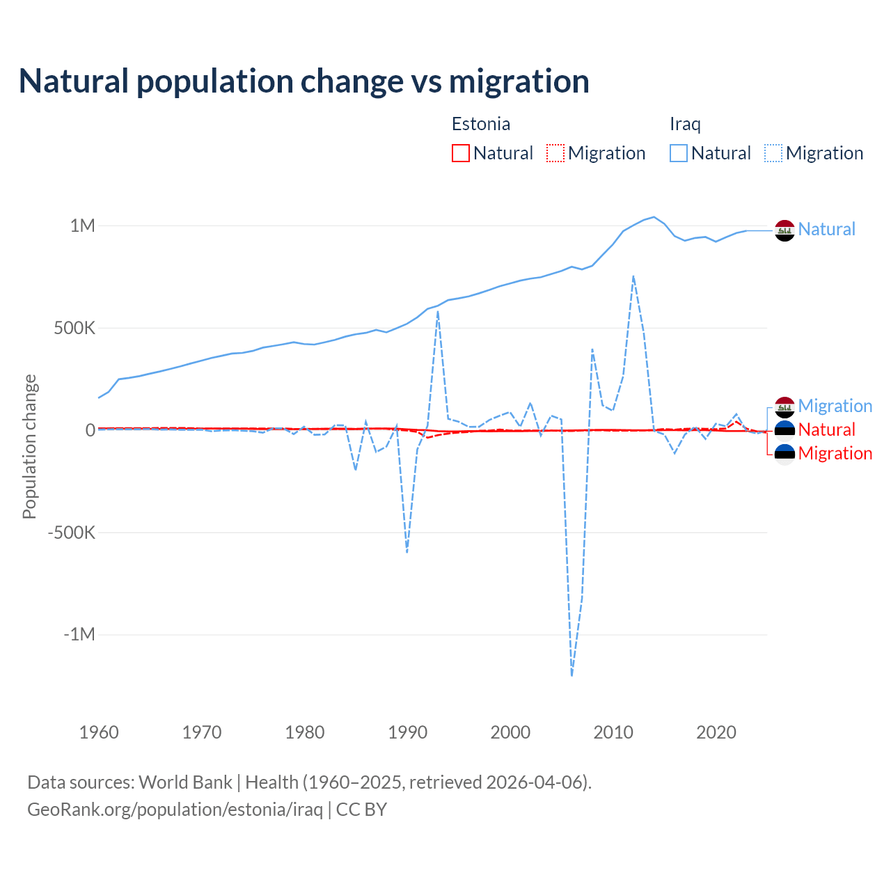 Over the last 10 years, 26.1% of the population change in Estonia is from natural causes (a loss of 27,683 people) and 73.9% is from migration (a gain of 78,553 people). In Iraq 99.2% is from natural causes (a gain of 9,598,842 people) and 0.76% is from migration (a loss of 73,050 people).