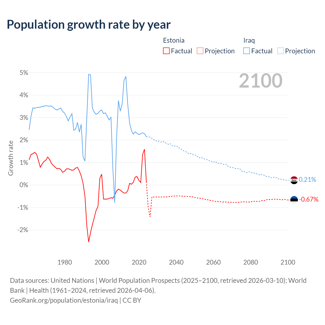 - For the last 10 years, Estonia has had an average growth rate of +0.37% per year vs +2.45% in Iraq.
