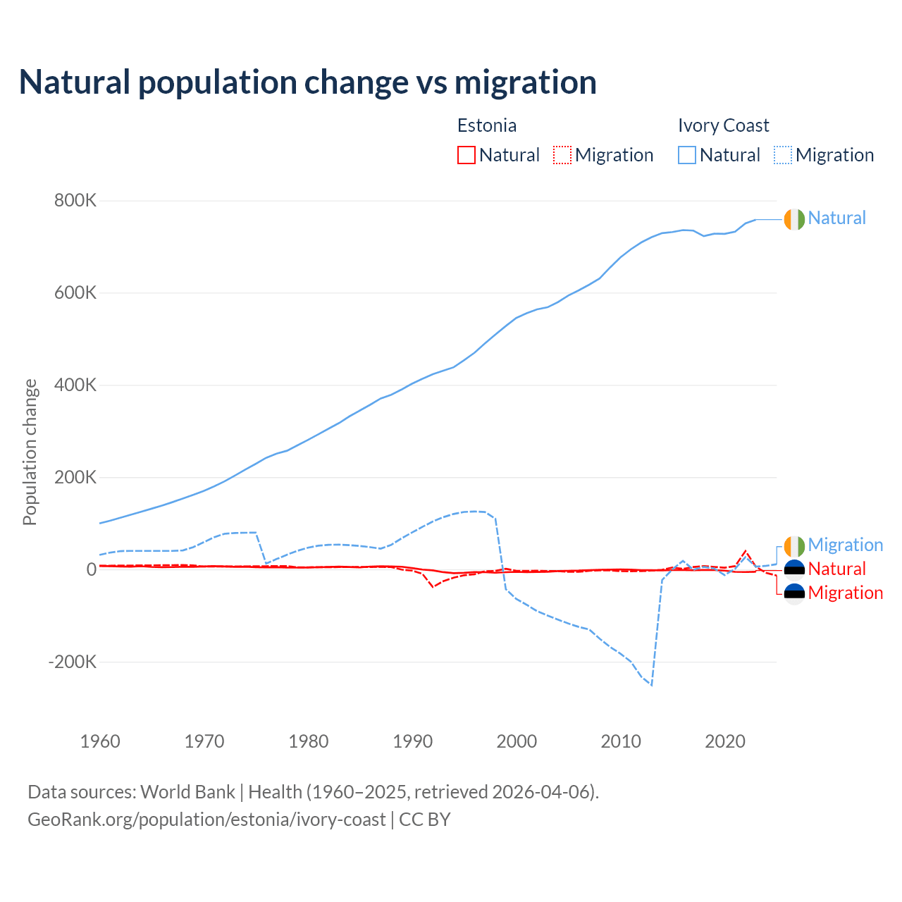 Over the last 10 years, 26.1% of the population change in Estonia is from natural causes (a loss of 27,683 people) and 73.9% is from migration (a gain of 78,553 people). In Ivory Coast 99.7% is from natural causes (a gain of 7,348,944 people) and 0.33% is from migration (a gain of 24,432 people).