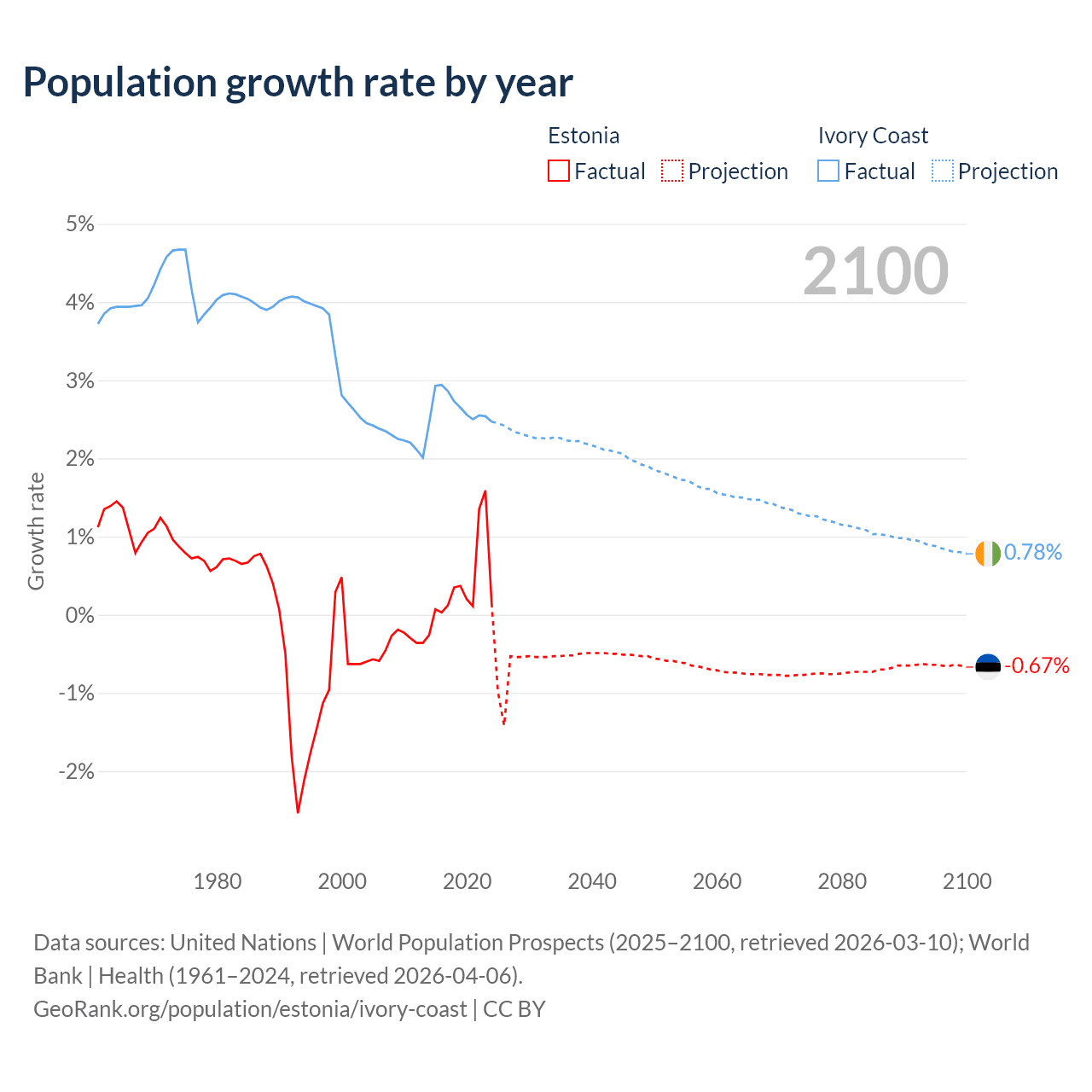 - For the last 10 years, Estonia has had an average growth rate of +0.37% per year vs +2.65% in Ivory Coast.