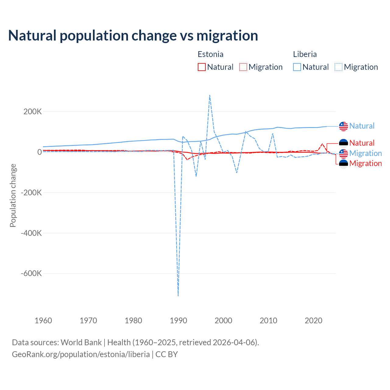 Over the last 10 years, 26.1% of the population change in Estonia is from natural causes (a loss of 27,683 people) and 73.9% is from migration (a gain of 78,553 people). In Liberia 87.7% is from natural causes (a gain of 1,202,387 people) and 12.3% is from migration (a loss of 168,316 people).