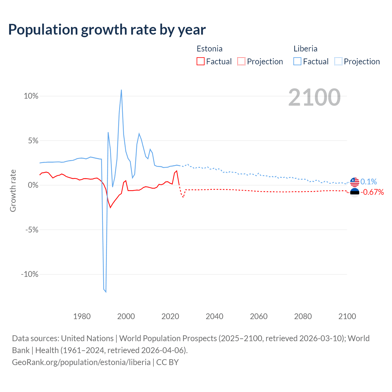- For the last 10 years, Estonia has had an average growth rate of +0.37% per year vs +2.09% in Liberia.