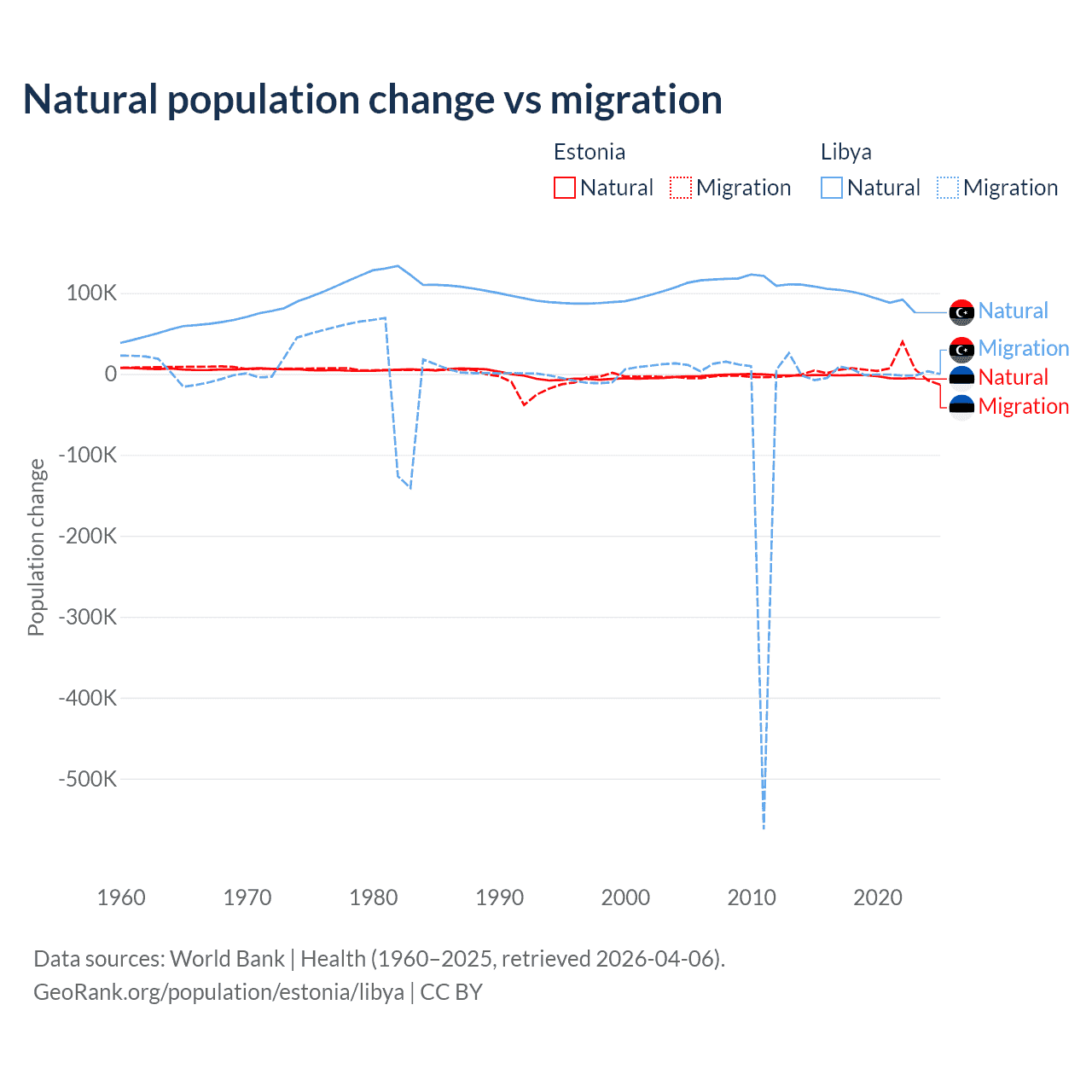 Over the last 10 years, 26.1% of the population change in Estonia is from natural causes (a loss of 27,683 people) and 73.9% is from migration (a gain of 78,553 people). In Libya 99.4% is from natural causes (a gain of 975,799 people) and 0.63% is from migration (a loss of 6,150 people).