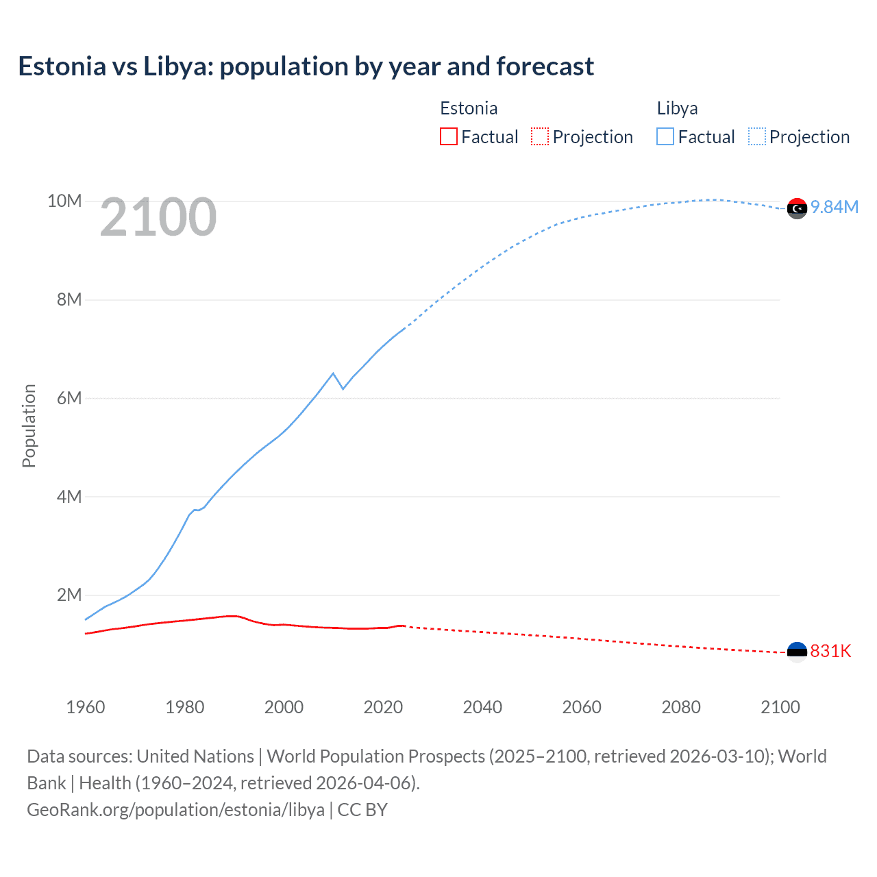 - Since 2006, the population of Estonia has decreased from 1.35M people to 1.34M (0.54% decline), while Libya has grown from 5.98M to 7.56M (26.4% growth).