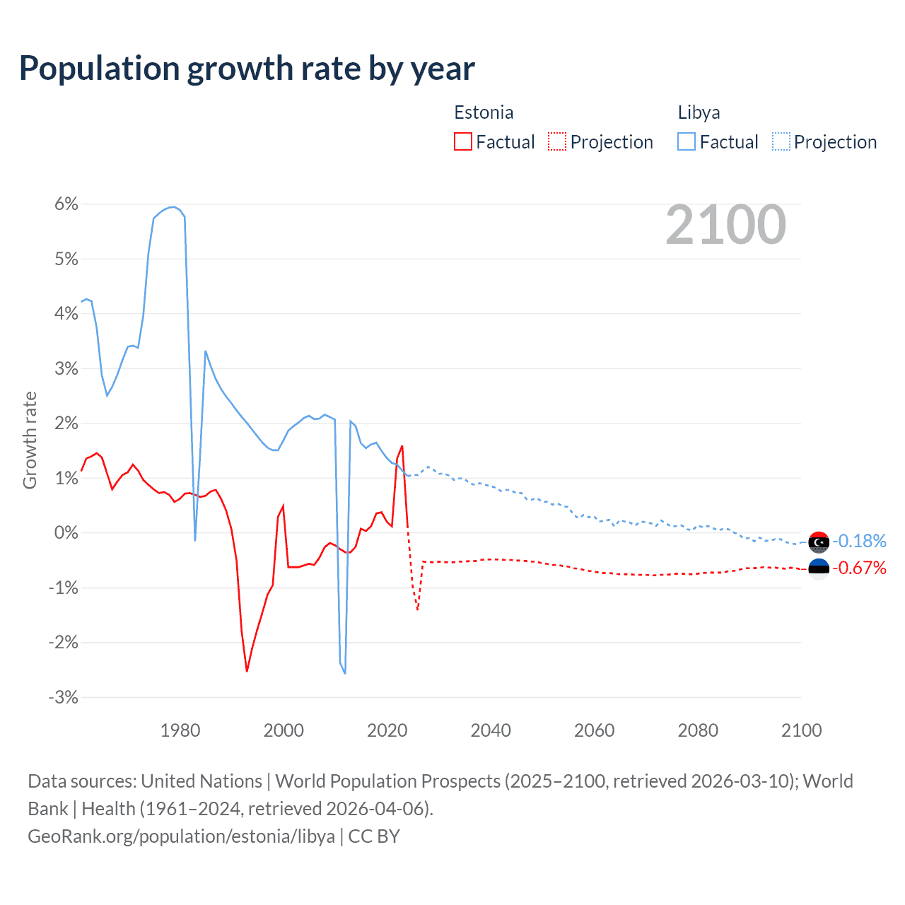 - For the last 10 years, Estonia has had an average growth rate of +0.37% per year vs +1.44% in Libya.