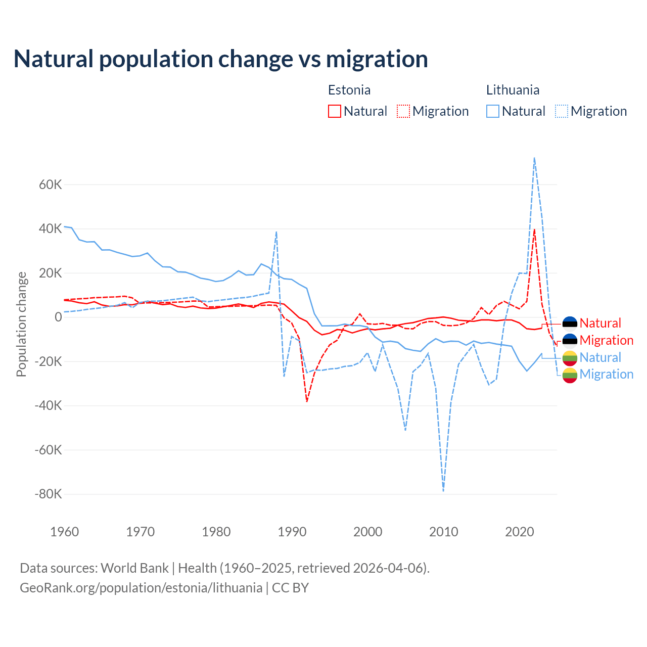 Over the last 10 years, 26.1% of the population change in Estonia is from natural causes (a loss of 27,683 people) and 73.9% is from migration (a gain of 78,553 people). In Lithuania 68.7% is from natural causes (a loss of 153,859 people) and 31.3% is from migration (a gain of 70,196 people).