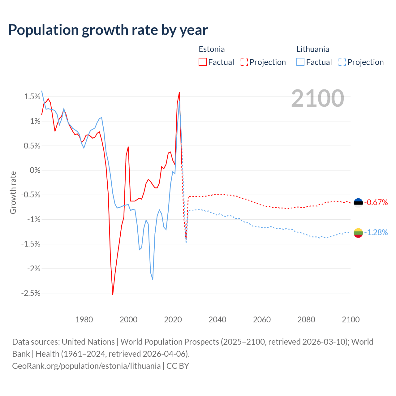 - For the last 10 years, Estonia has had an average growth rate of +0.37% per year vs -0.22% in Lithuania.
