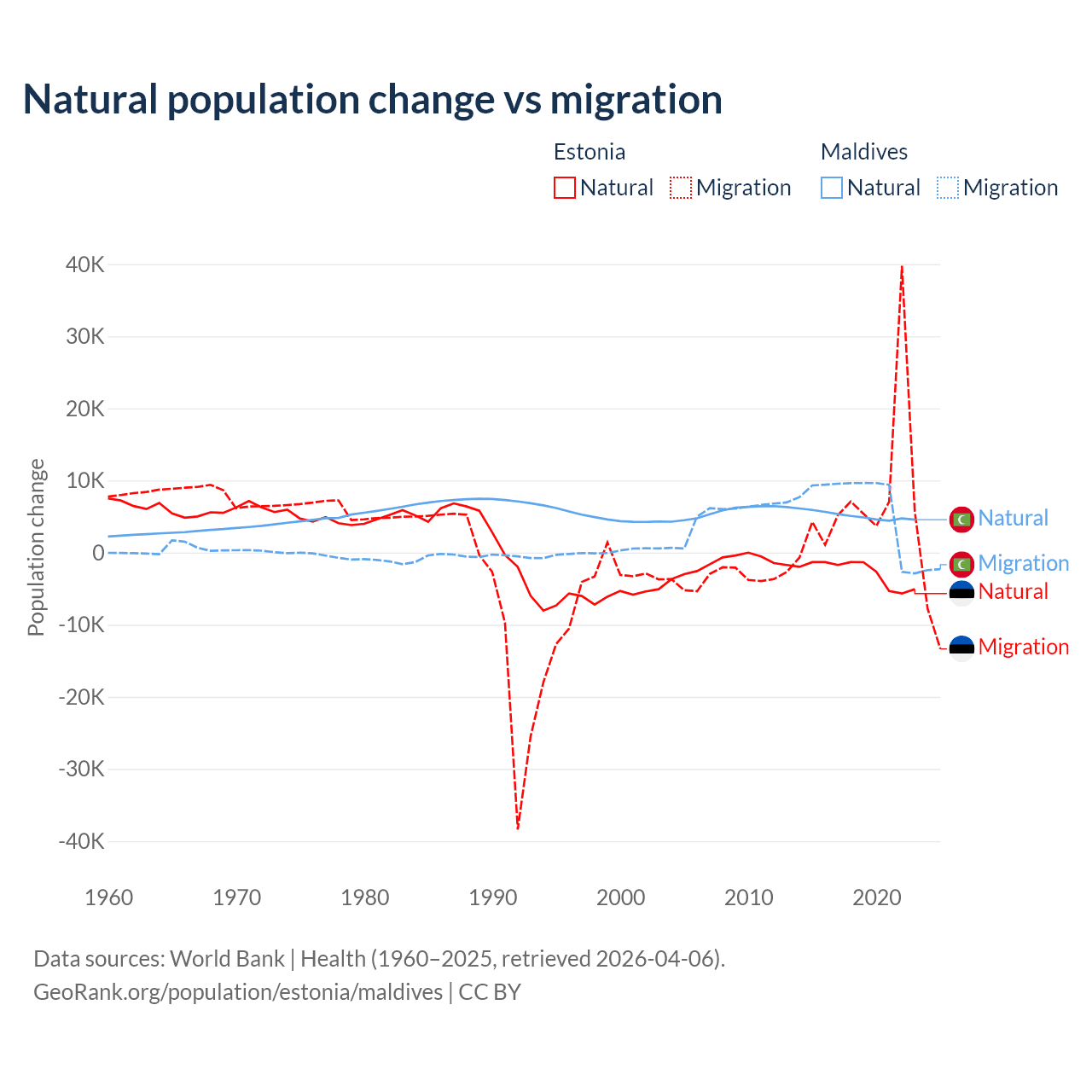 Over the last 10 years, 26.1% of the population change in Estonia is from natural causes (a loss of 27,683 people) and 73.9% is from migration (a gain of 78,553 people). In Maldives 42.7% is from natural causes (a gain of 51,342 people) and 57.3% is from migration (a gain of 68,788 people).