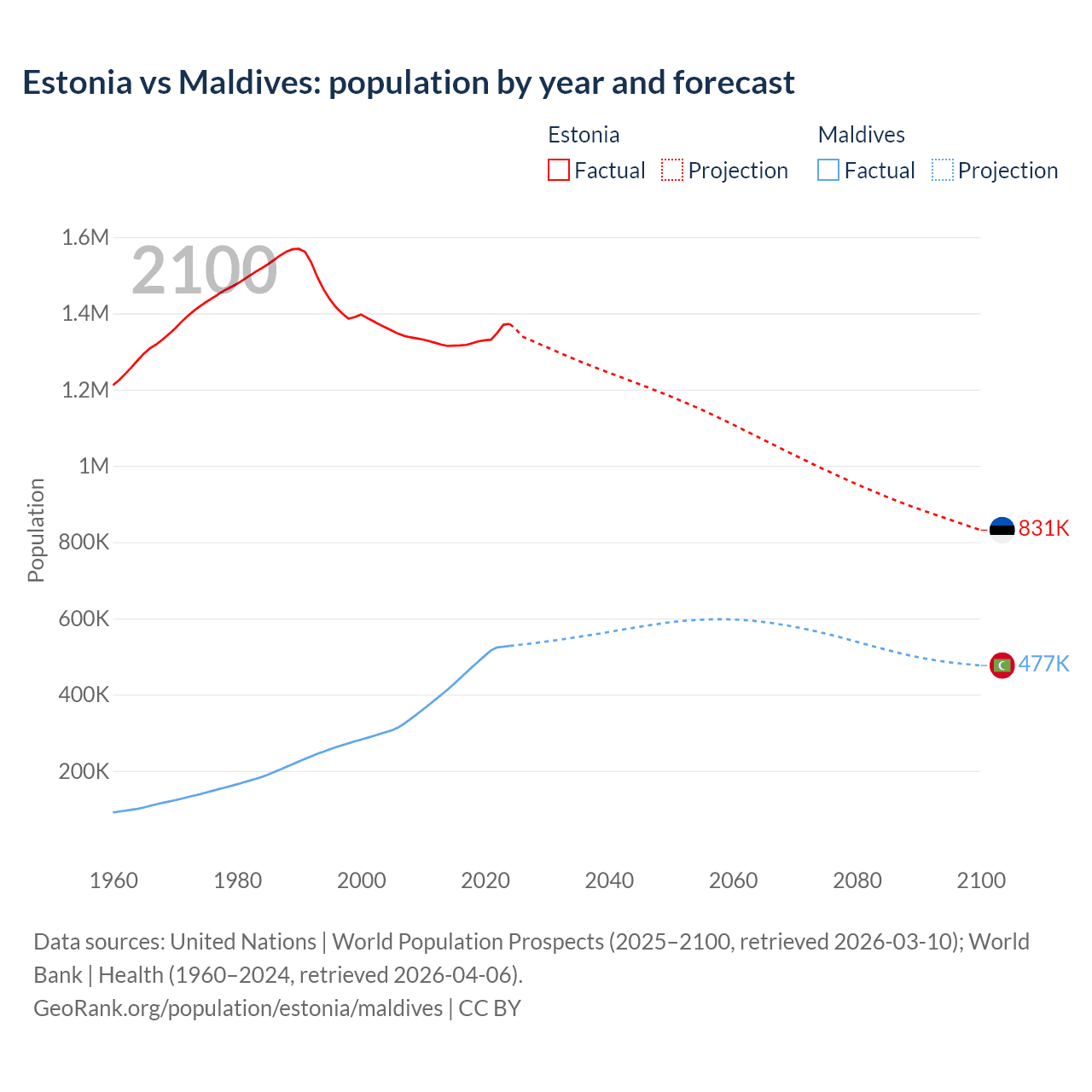 Estonia vs Maldives: population by year and forecast