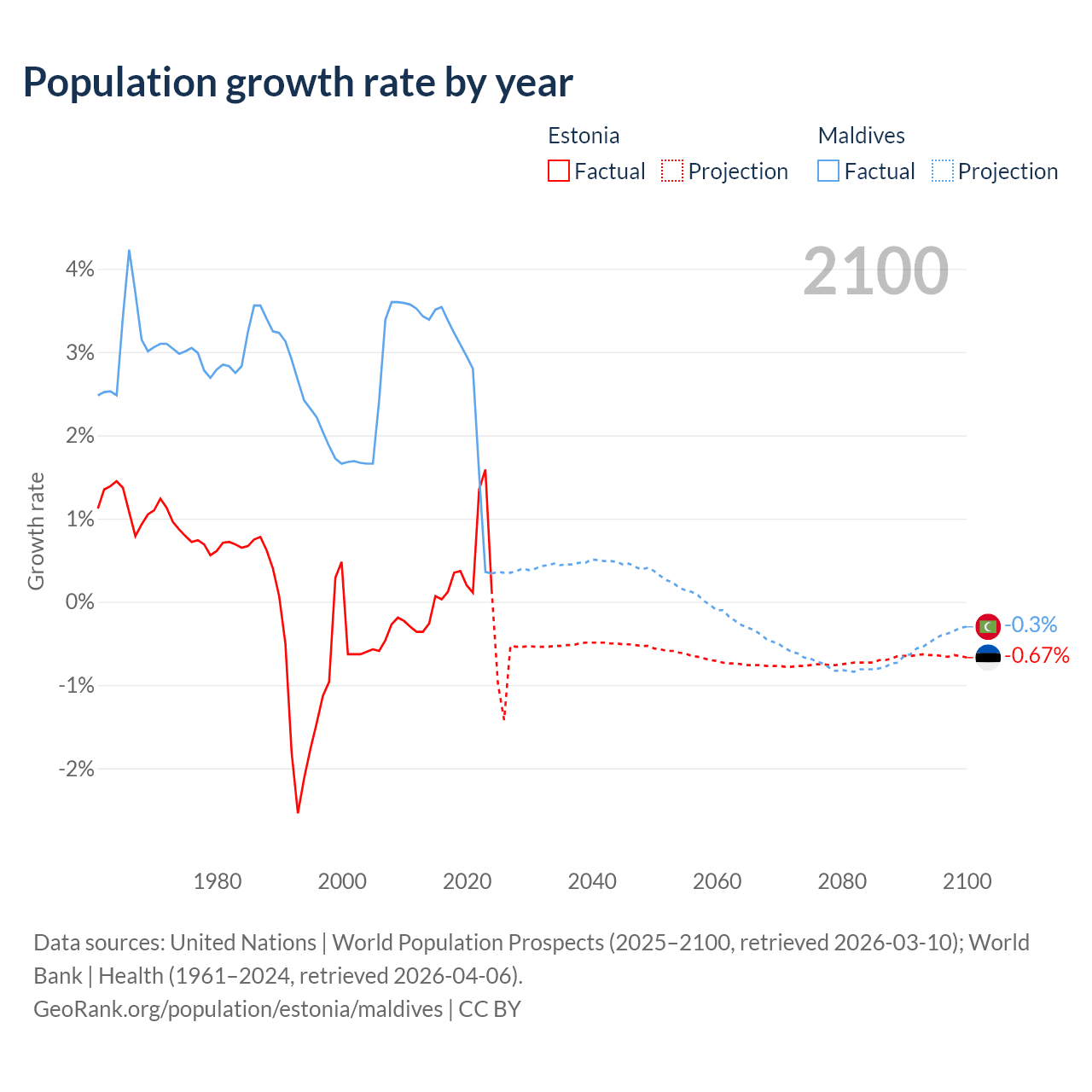 Data sources: World Bank | Health (1960–2024, retrieved 2026-04-06); United Nations | World Population Prospects (1960–2026, retrieved 2026-03-10); U.S. Census Bureau (1960–2025, retrieved 2026-02-08); Central Intelligence Agency (CIA) (2000–2019, retrieved 2026-02-20).