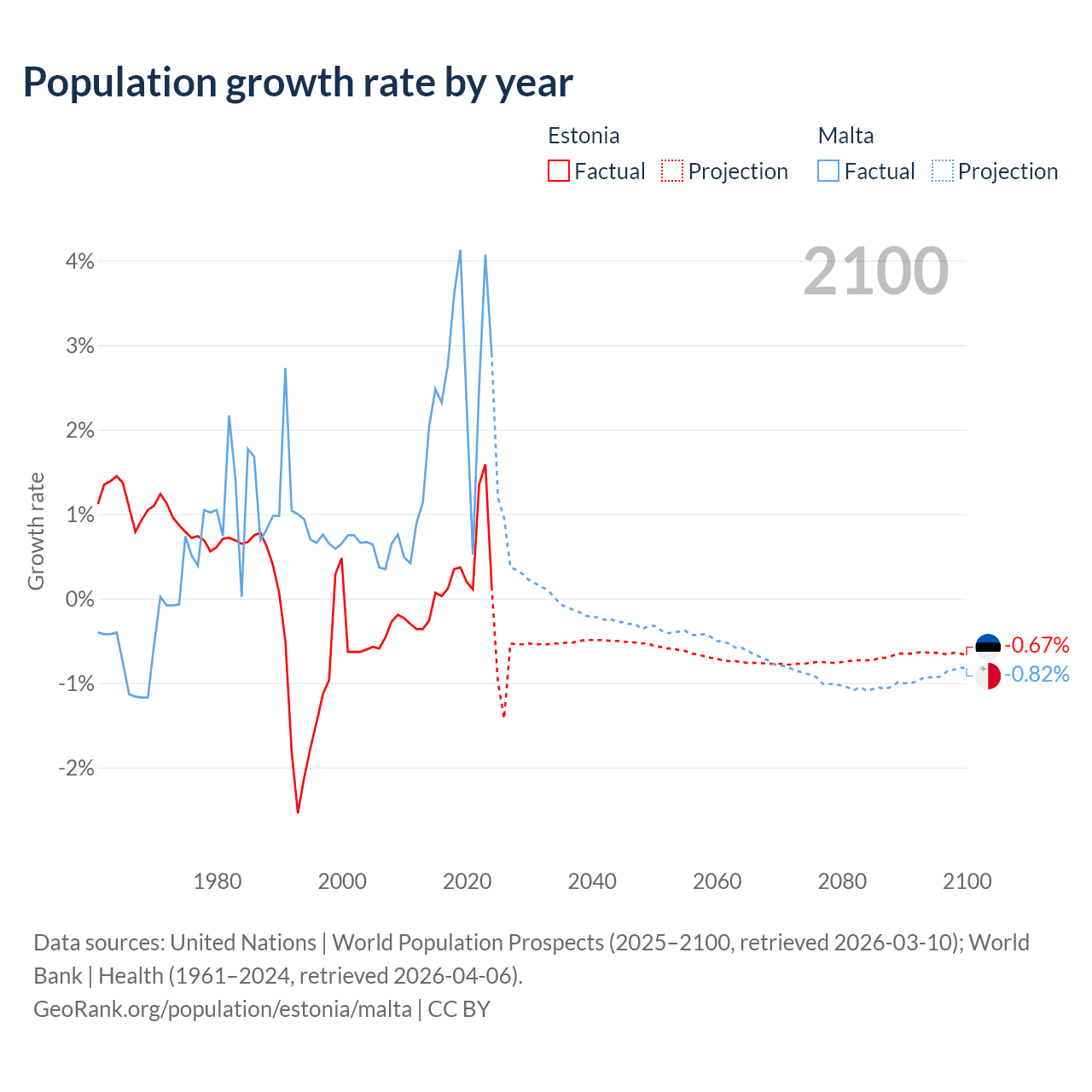 - For the last 10 years, Estonia has had an average growth rate of +0.37% per year vs +2.69% in Malta.