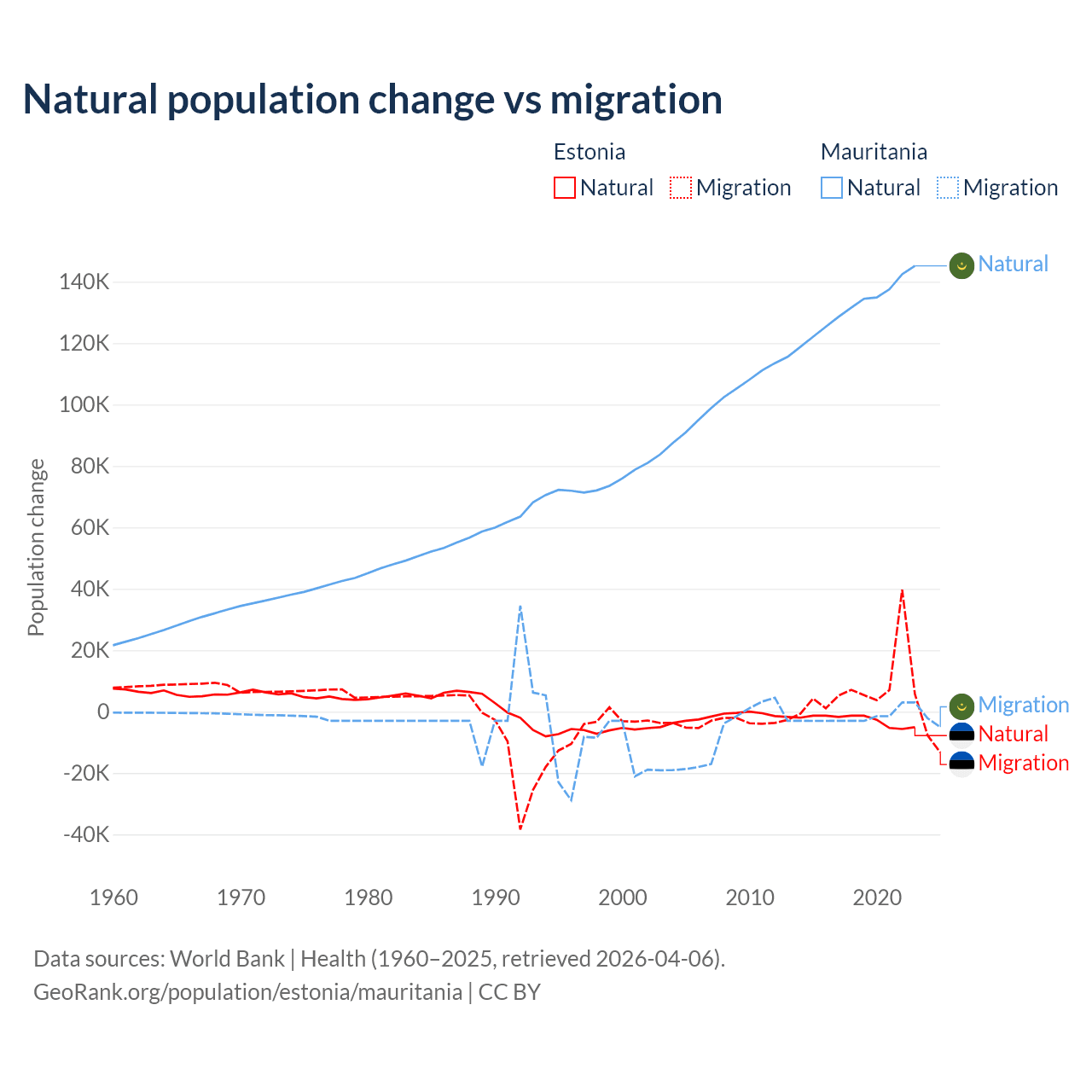 Over the last 10 years, 26.1% of the population change in Estonia is from natural causes (a loss of 27,683 people) and 73.9% is from migration (a gain of 78,553 people). In Mauritania 98.9% is from natural causes (a gain of 1,320,903 people) and 1.12% is from migration (a loss of 14,982 people).
