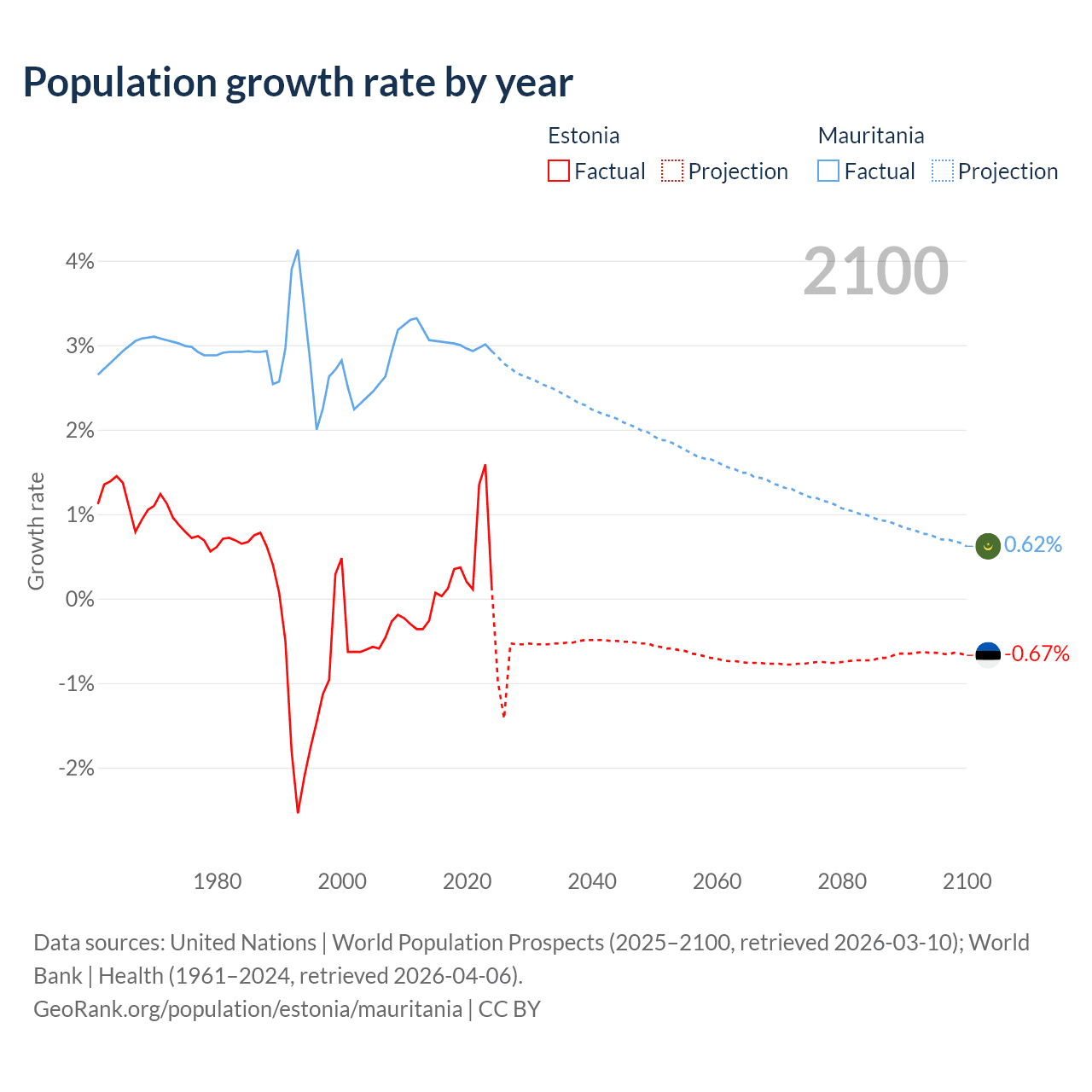- For the last 10 years, Estonia has had an average growth rate of +0.37% per year vs +3% in Mauritania.