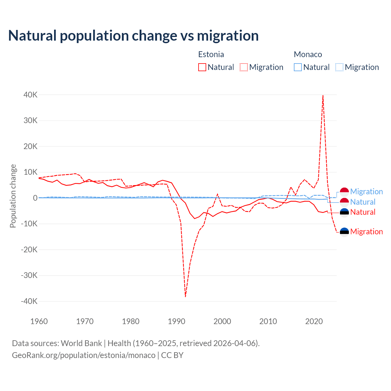 Over the last 10 years, 26.1% of the population change in Estonia is from natural causes (a loss of 27,683 people) and 73.9% is from migration (a gain of 78,553 people). In Monaco 37.3% is from natural causes (a loss of 4,357 people) and 62.7% is from migration (a gain of 7,333 people).