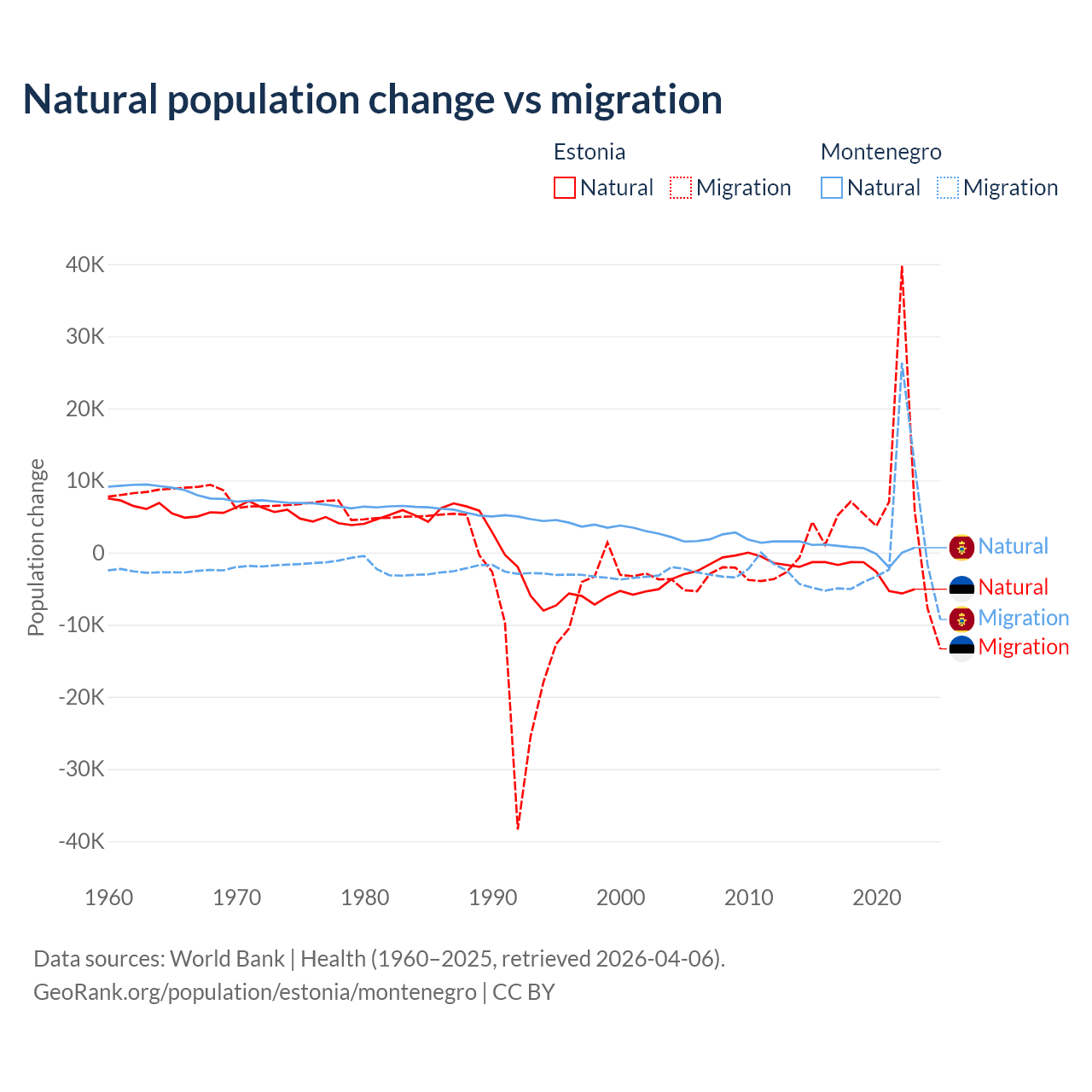 Over the last 10 years, 26.1% of the population change in Estonia is from natural causes (a loss of 27,683 people) and 73.9% is from migration (a gain of 78,553 people). In Montenegro 52.4% is from natural causes (a gain of 4,501 people) and 47.6% is from migration (a gain of 4,095 people).