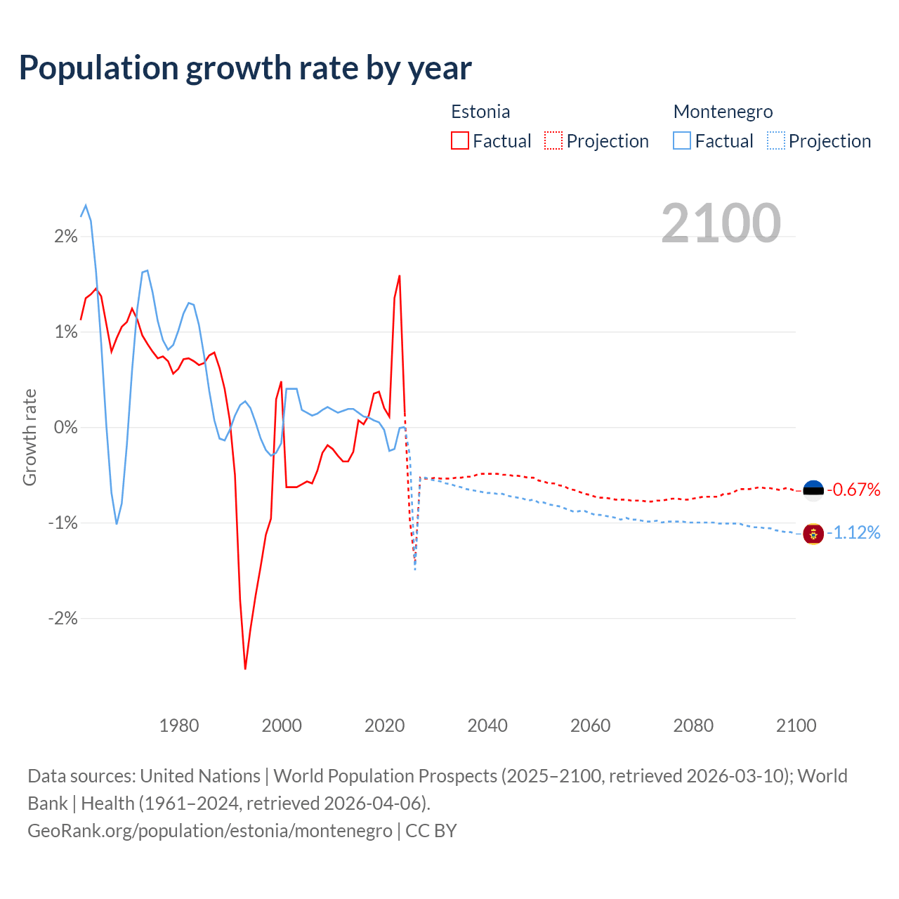 - For the last 10 years, Estonia has had an average growth rate of +0.37% per year vs +0.01% in Montenegro.