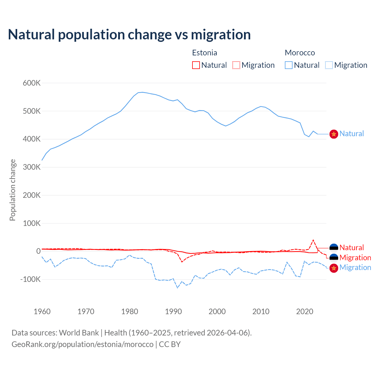 Over the last 10 years, 26.1% of the population change in Estonia is from natural causes (a loss of 27,683 people) and 73.9% is from migration (a gain of 78,553 people). In Morocco 88.3% is from natural causes (a gain of 4,495,223 people) and 11.7% is from migration (a loss of 594,083 people).