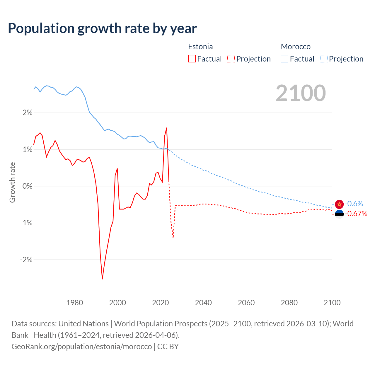 - For the last 10 years, Estonia has had an average growth rate of +0.37% per year vs +1.09% in Morocco.