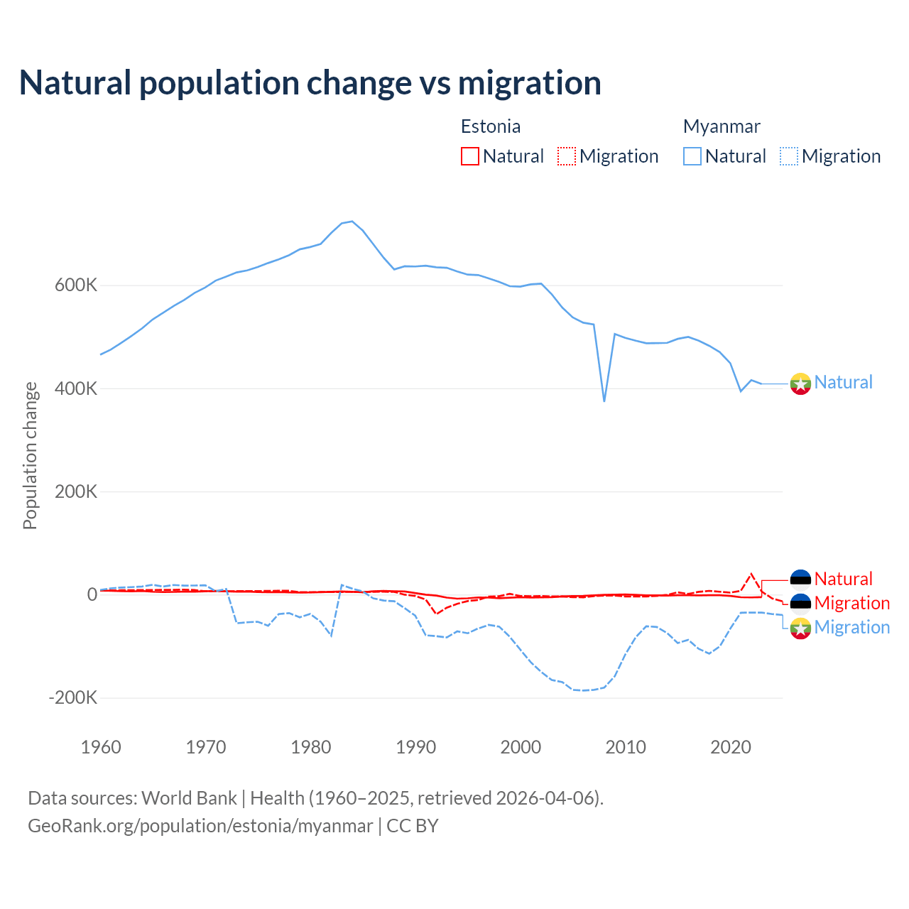 Over the last 10 years, 26.1% of the population change in Estonia is from natural causes (a loss of 27,683 people) and 73.9% is from migration (a gain of 78,553 people). In Myanmar 86% is from natural causes (a gain of 4,594,615 people) and 14% is from migration (a loss of 749,272 people).