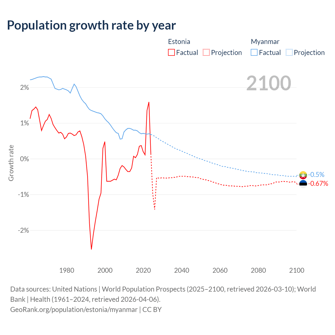 - For the last 10 years, Estonia has had an average growth rate of +0.37% per year vs +0.74% in Myanmar.