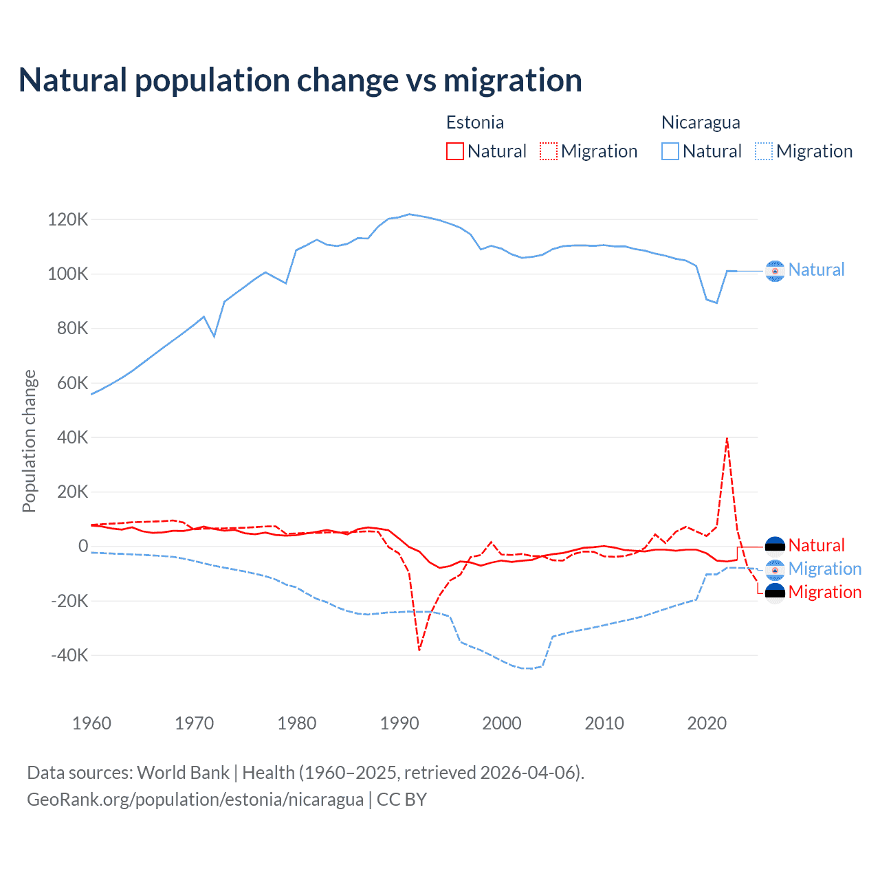 Over the last 10 years, 26.1% of the population change in Estonia is from natural causes (a loss of 27,683 people) and 73.9% is from migration (a gain of 78,553 people). In Nicaragua 85.5% is from natural causes (a gain of 1,017,084 people) and 14.5% is from migration (a loss of 172,078 people).