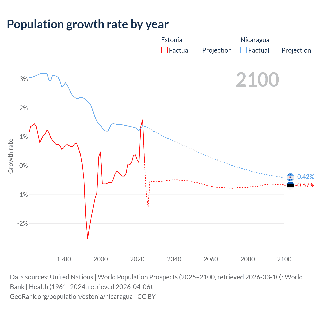 Data sources: World Bank | Health (1960–2024, retrieved 2026-04-06); United Nations | World Population Prospects (1960–2026, retrieved 2026-03-10); U.S. Census Bureau (1960–2025, retrieved 2026-02-08); Central Intelligence Agency (CIA) (2000–2019, retrieved 2026-02-20).