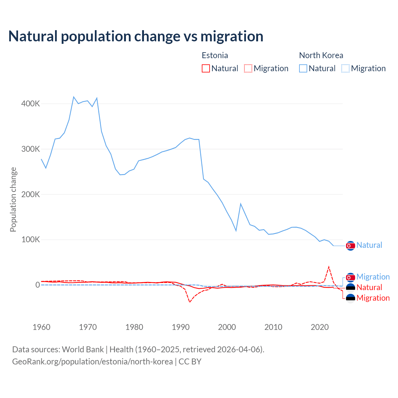 Over the last 10 years, 26.1% of the population change in Estonia is from natural causes (a loss of 27,683 people) and 73.9% is from migration (a gain of 78,553 people). In North Korea 97.7% is from natural causes (a gain of 1,097,372 people) and 2.33% is from migration (a loss of 26,227 people).