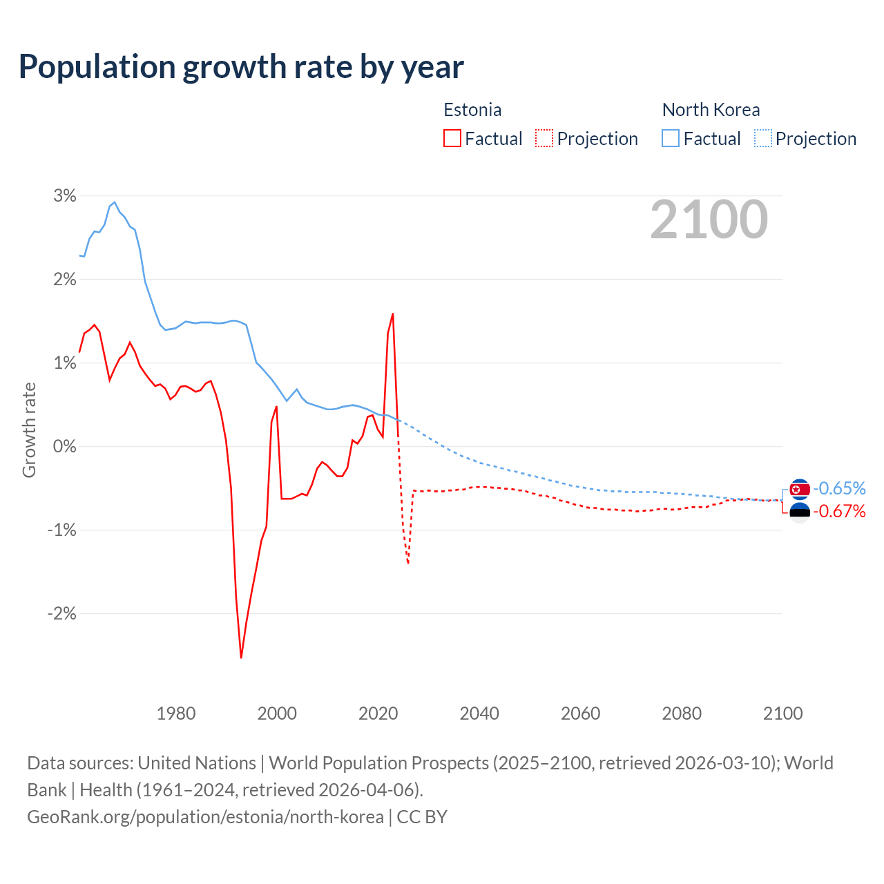 - For the last 10 years, Estonia has had an average growth rate of +0.37% per year vs +0.41% in North Korea.