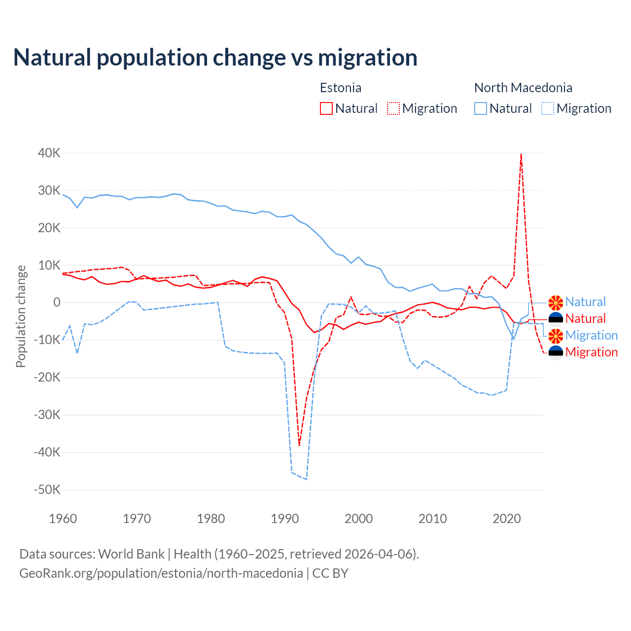 Over the last 10 years, 26.1% of the population change in Estonia is from natural causes (a loss of 27,683 people) and 73.9% is from migration (a gain of 78,553 people). In North Macedonia 6.45% is from natural causes (a loss of 12,585 people) and 93.5% is from migration (a loss of 182,429 people).