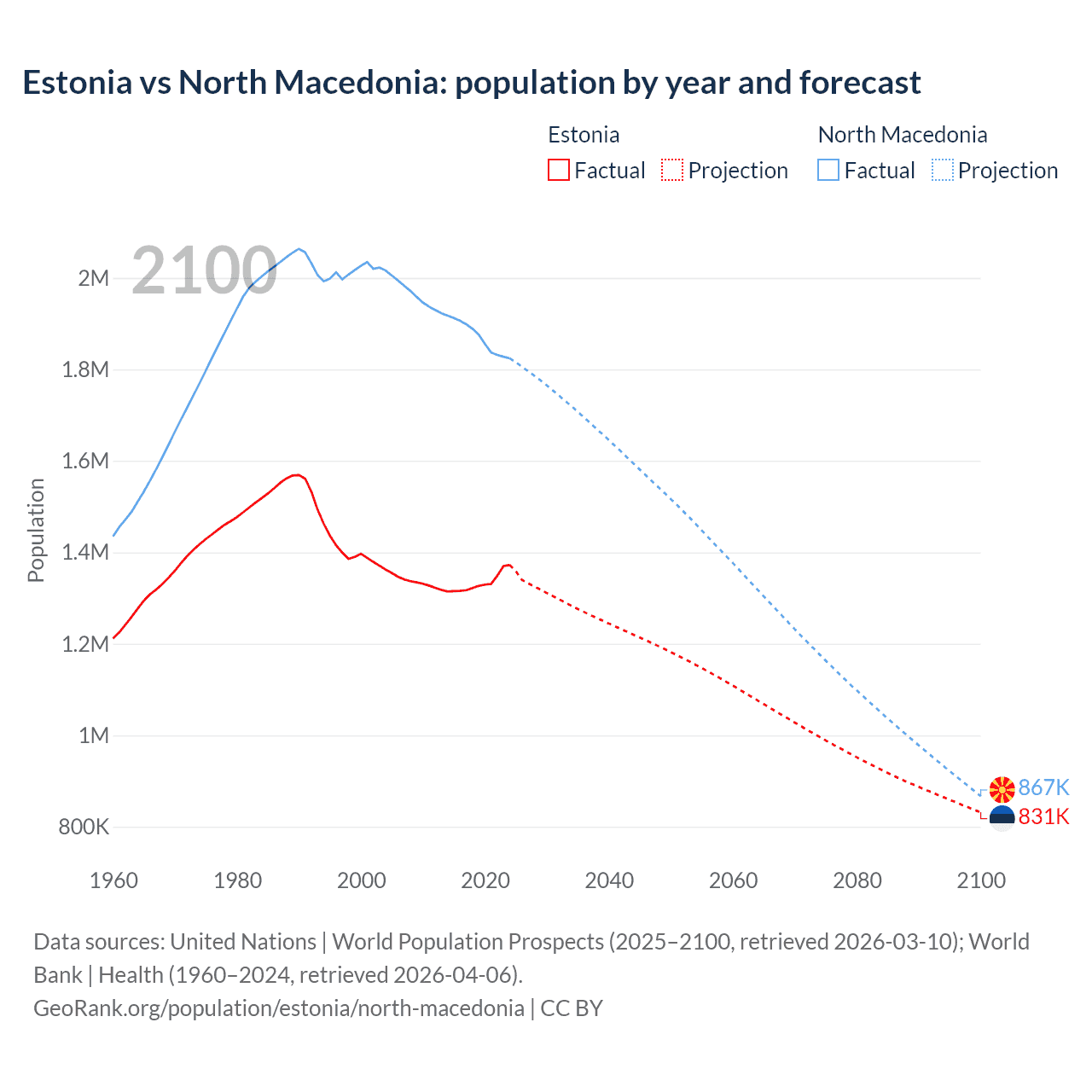 Estonia vs North Macedonia: population by year and forecast