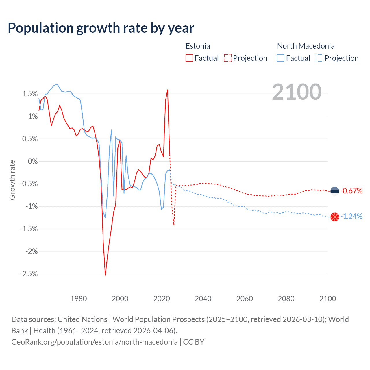 - For the last 10 years, Estonia has had an average growth rate of +0.37% per year vs -0.48% in North Macedonia.