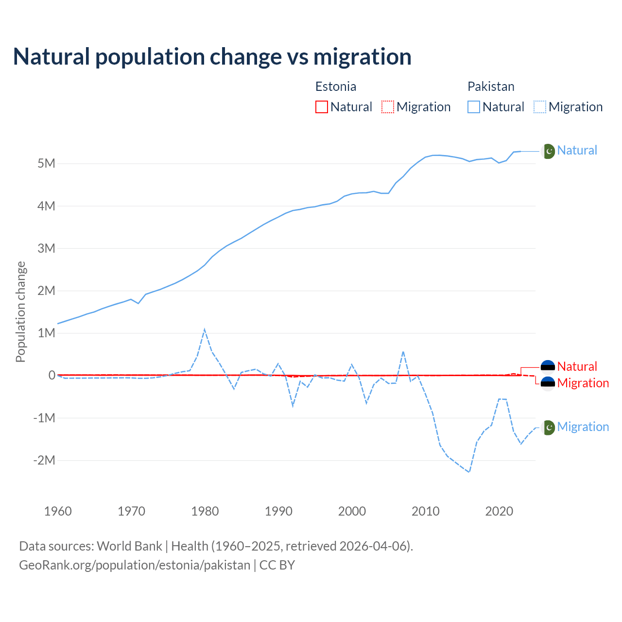 Over the last 10 years, 26.1% of the population change in Estonia is from natural causes (a loss of 27,683 people) and 73.9% is from migration (a gain of 78,553 people). In Pakistan 77.8% is from natural causes (a gain of 51,255,404 people) and 22.2% is from migration (a loss of 14,629,055 people).