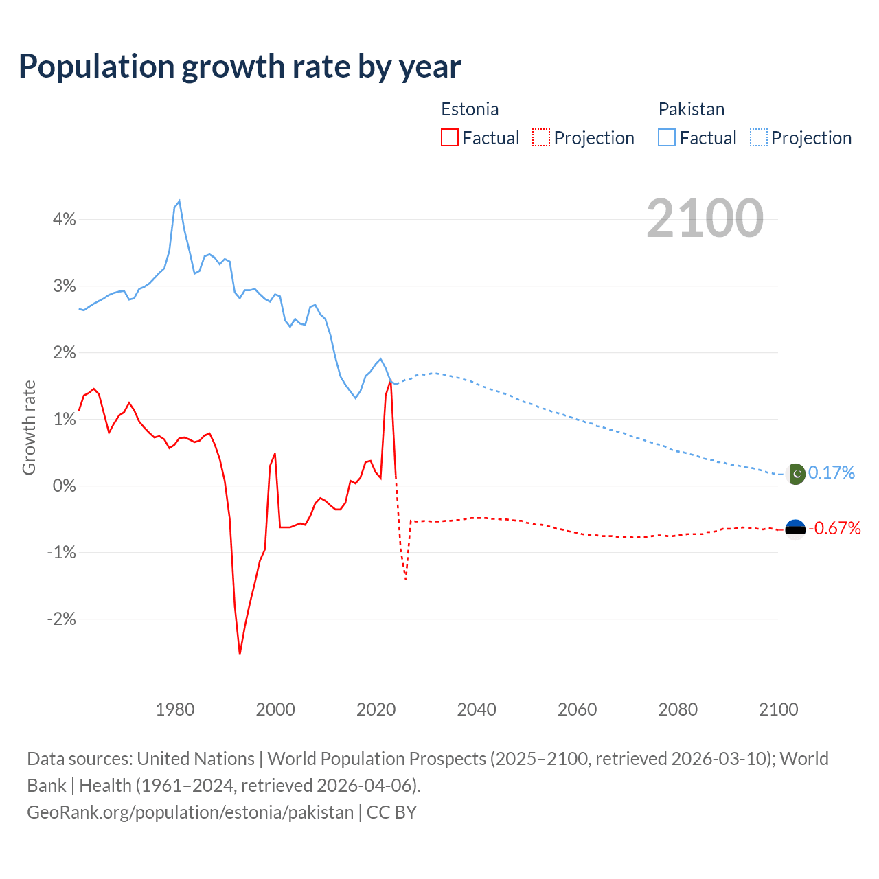 - For the last 10 years, Estonia has had an average growth rate of +0.37% per year vs +1.6% in Pakistan.
