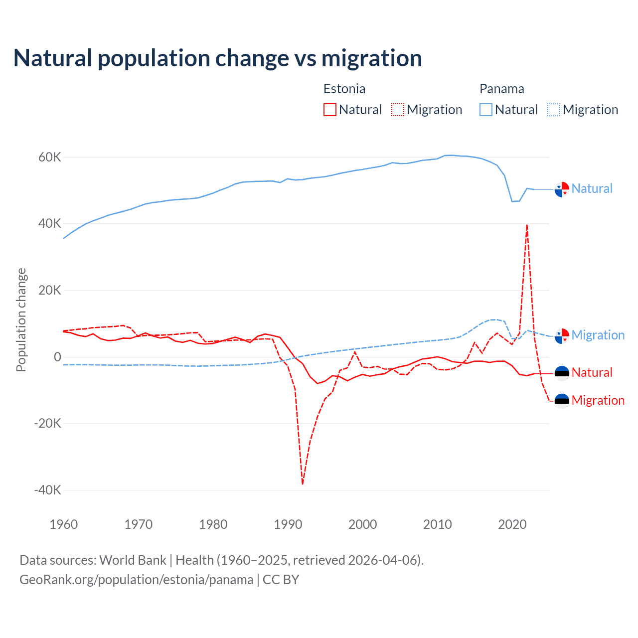 Over the last 10 years, 26.1% of the population change in Estonia is from natural causes (a loss of 27,683 people) and 73.9% is from migration (a gain of 78,553 people). In Panama 86.5% is from natural causes (a gain of 544,211 people) and 13.5% is from migration (a gain of 84,849 people).