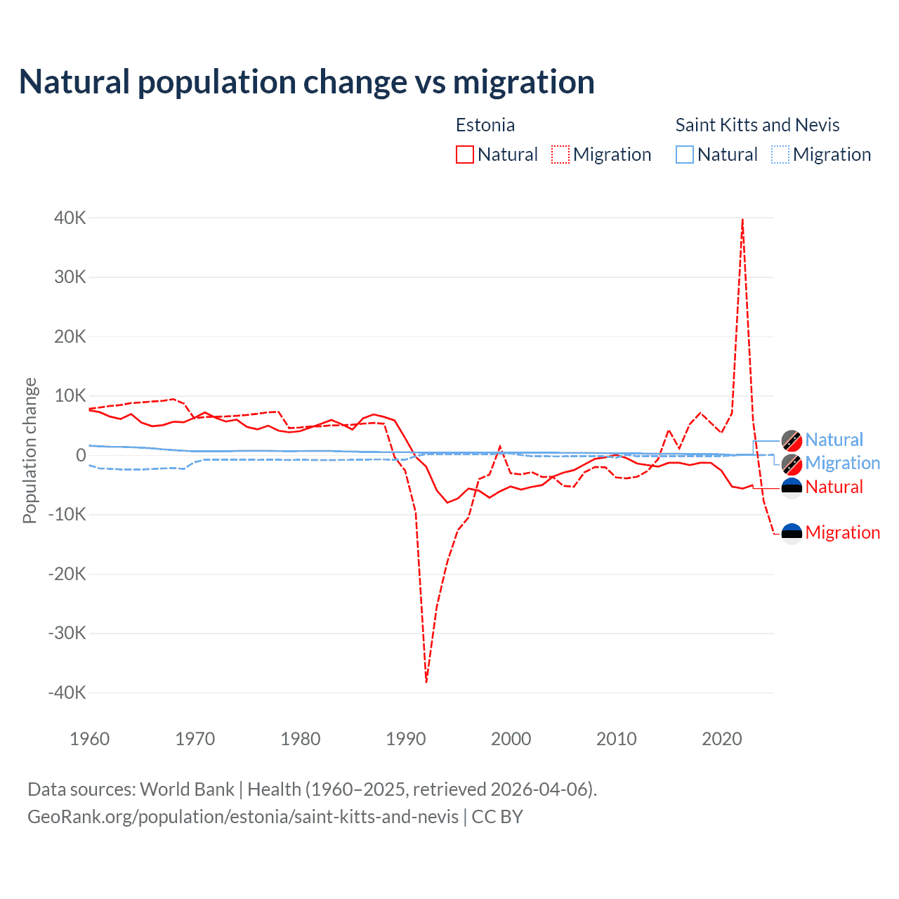Over the last 10 years, 26.1% of the population change in Estonia is from natural causes (a loss of 27,683 people) and 73.9% is from migration (a gain of 78,553 people). In Saint Kitts and Nevis 44.9% is from natural causes (a gain of 1,225 people) and 55.1% is from migration (a loss of 1,506 people).