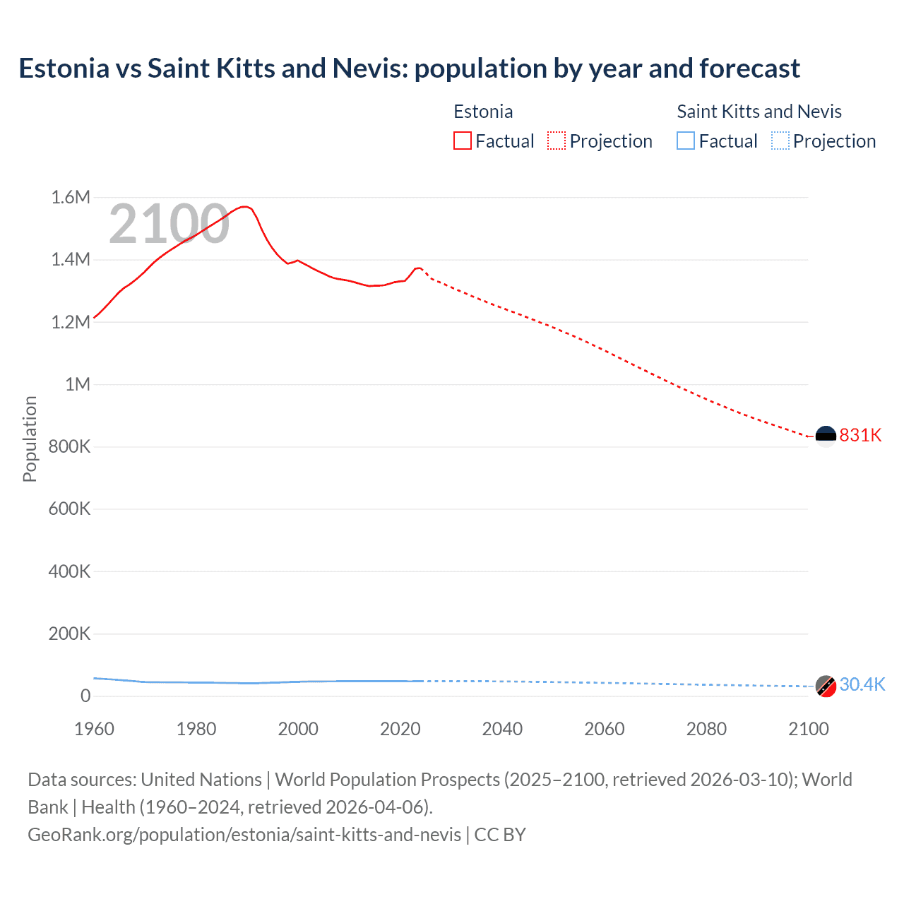 Estonia vs Saint Kitts and Nevis: population by year and forecast