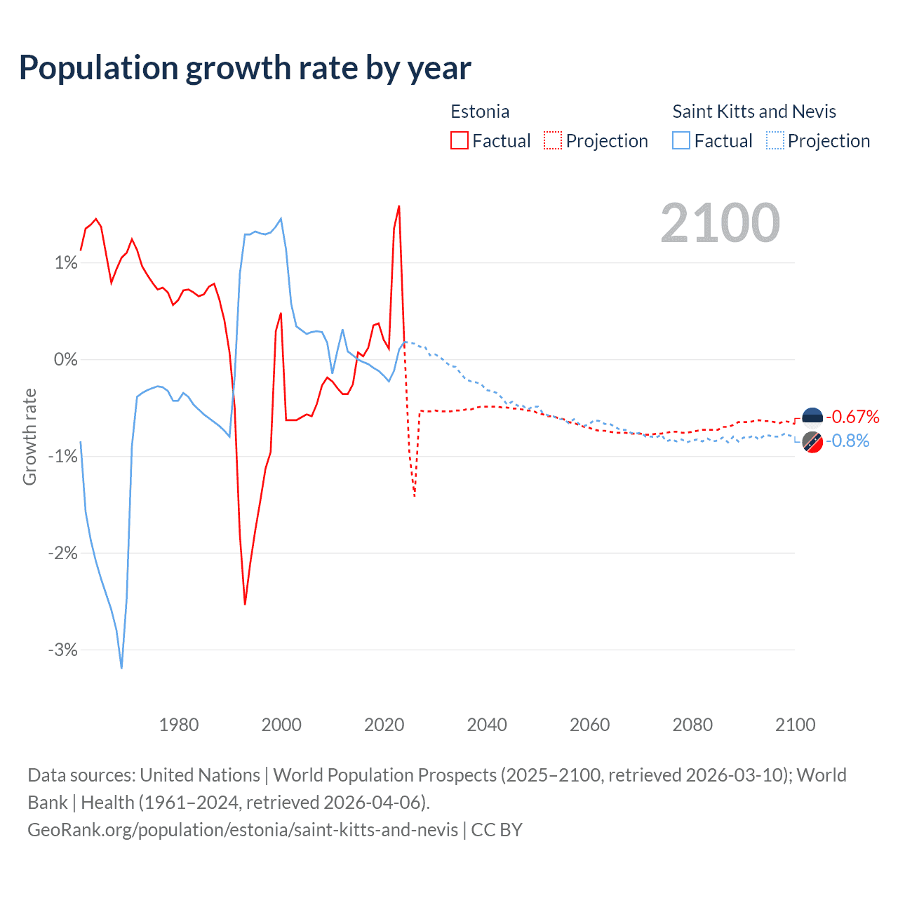 - For the last 10 years, Estonia has had an average growth rate of +0.37% per year vs -0.04% in Saint Kitts and Nevis.