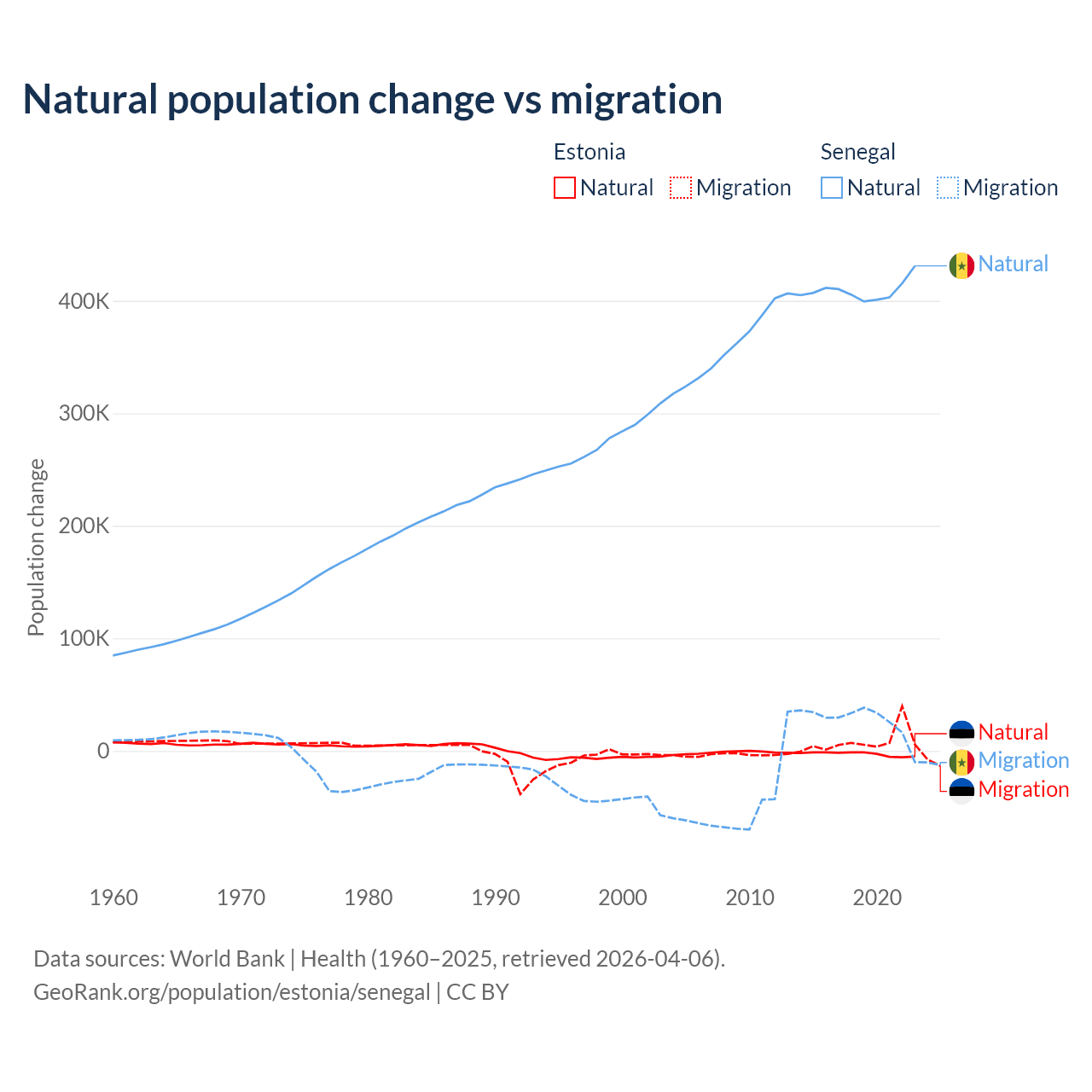 Over the last 10 years, 26.1% of the population change in Estonia is from natural causes (a loss of 27,683 people) and 73.9% is from migration (a gain of 78,553 people). In Senegal 93.9% is from natural causes (a gain of 4,089,205 people) and 6.13% is from migration (a gain of 267,266 people).