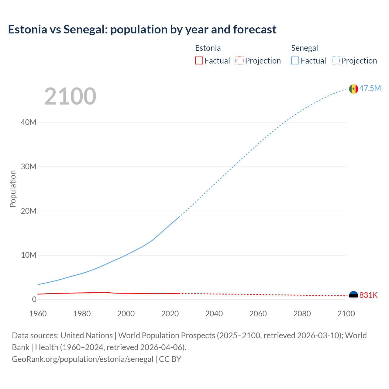 Estonia vs Senegal: population by year and forecast