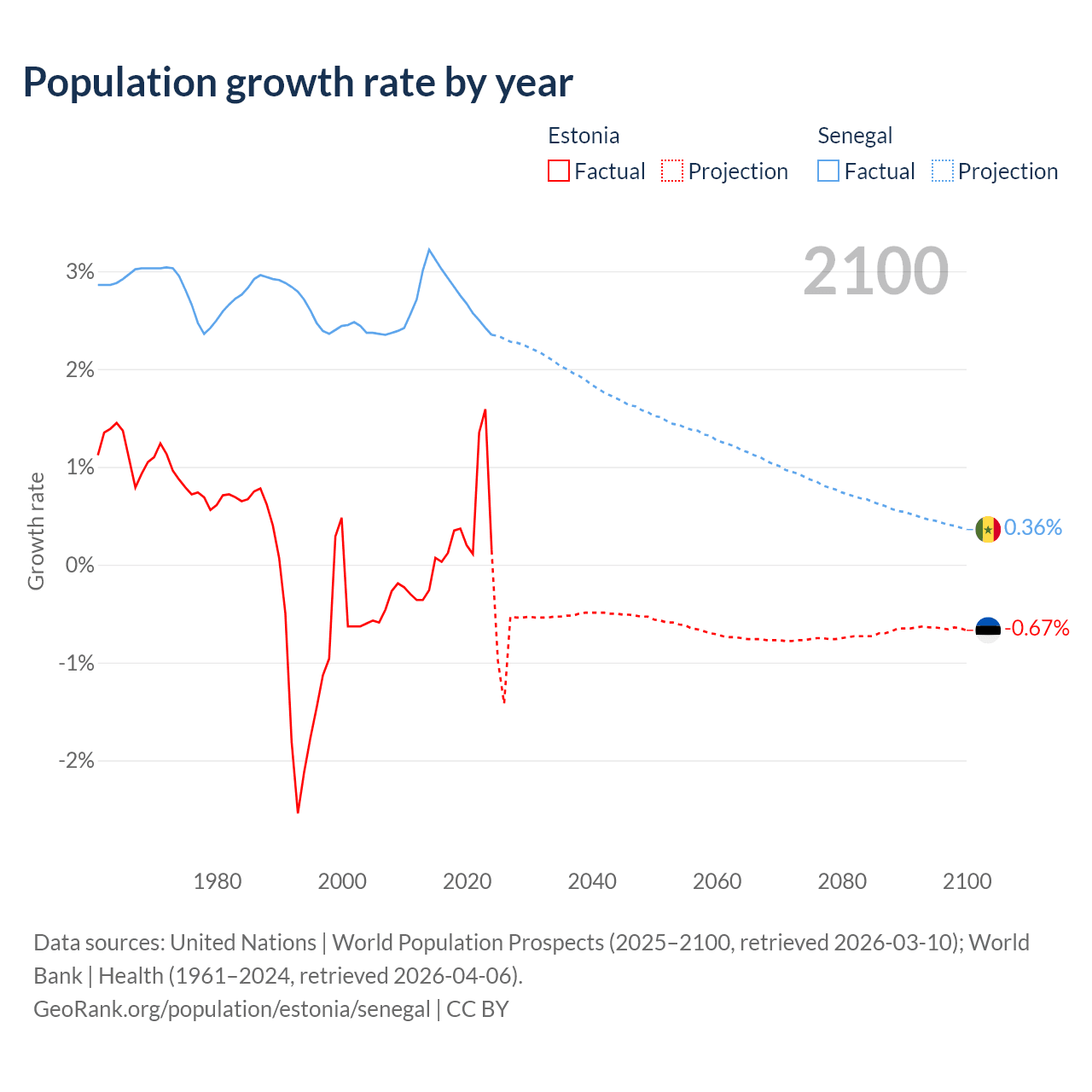 - For the last 10 years, Estonia has had an average growth rate of +0.37% per year vs +2.76% in Senegal.