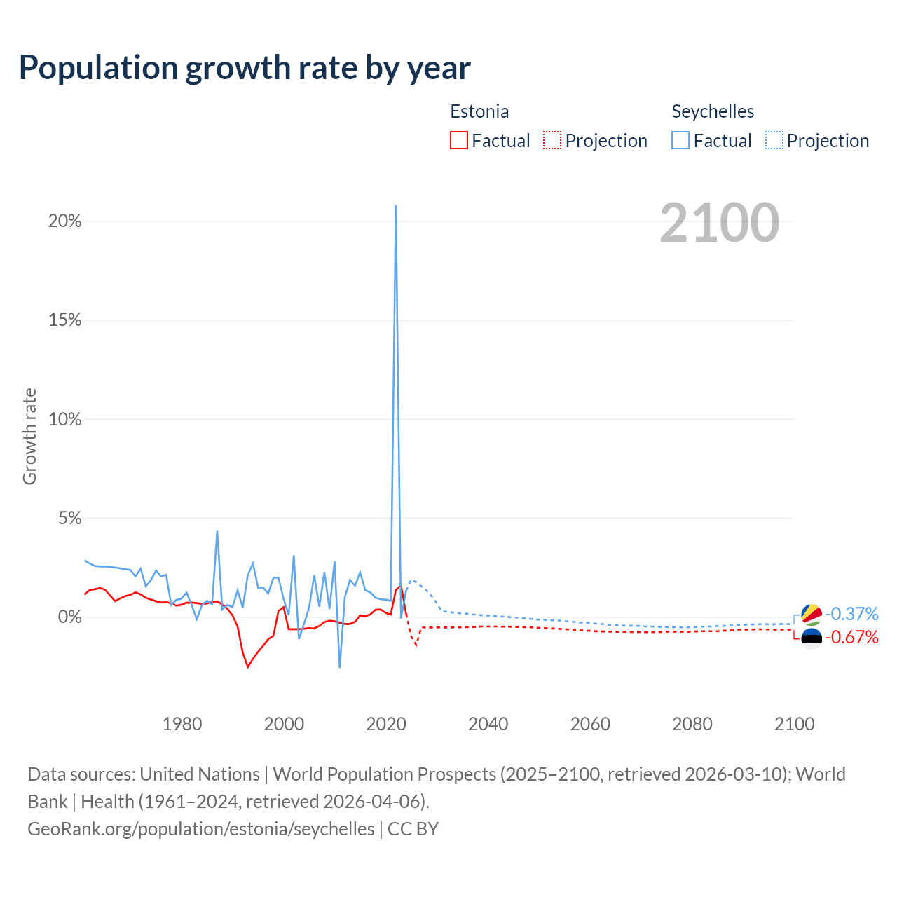 - Since 2006, the population of Estonia has decreased from 1.35M people to 1.34M (0.54% decline), while the Seychelles has grown from 84.6K to 126K (49.3% growth).