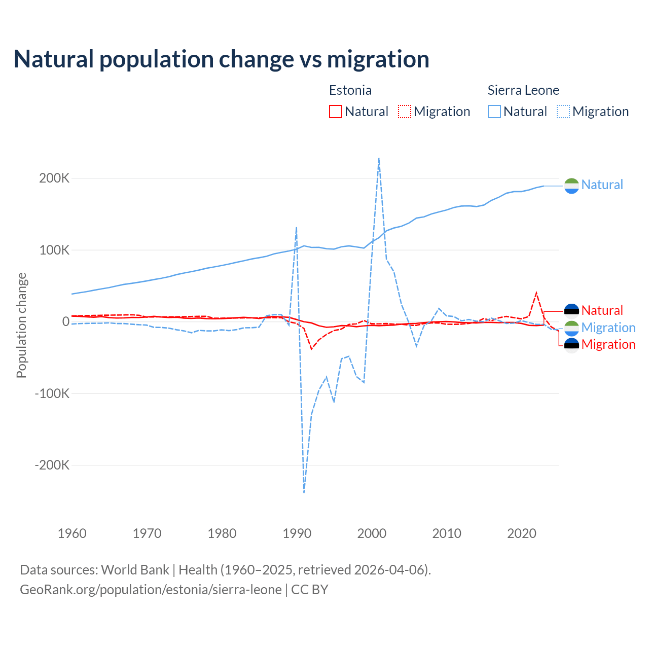 Over the last 10 years, 26.1% of the population change in Estonia is from natural causes (a loss of 27,683 people) and 73.9% is from migration (a gain of 78,553 people). In Sierra Leone 99.6% is from natural causes (a gain of 1,764,049 people) and 0.41% is from migration (a loss of 7,211 people).