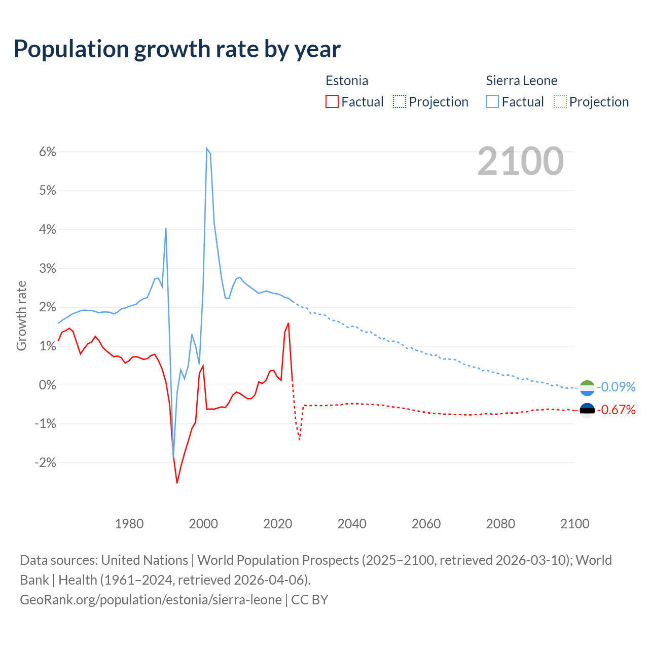 - For the last 10 years, Estonia has had an average growth rate of +0.37% per year vs +2.32% in Sierra Leone.