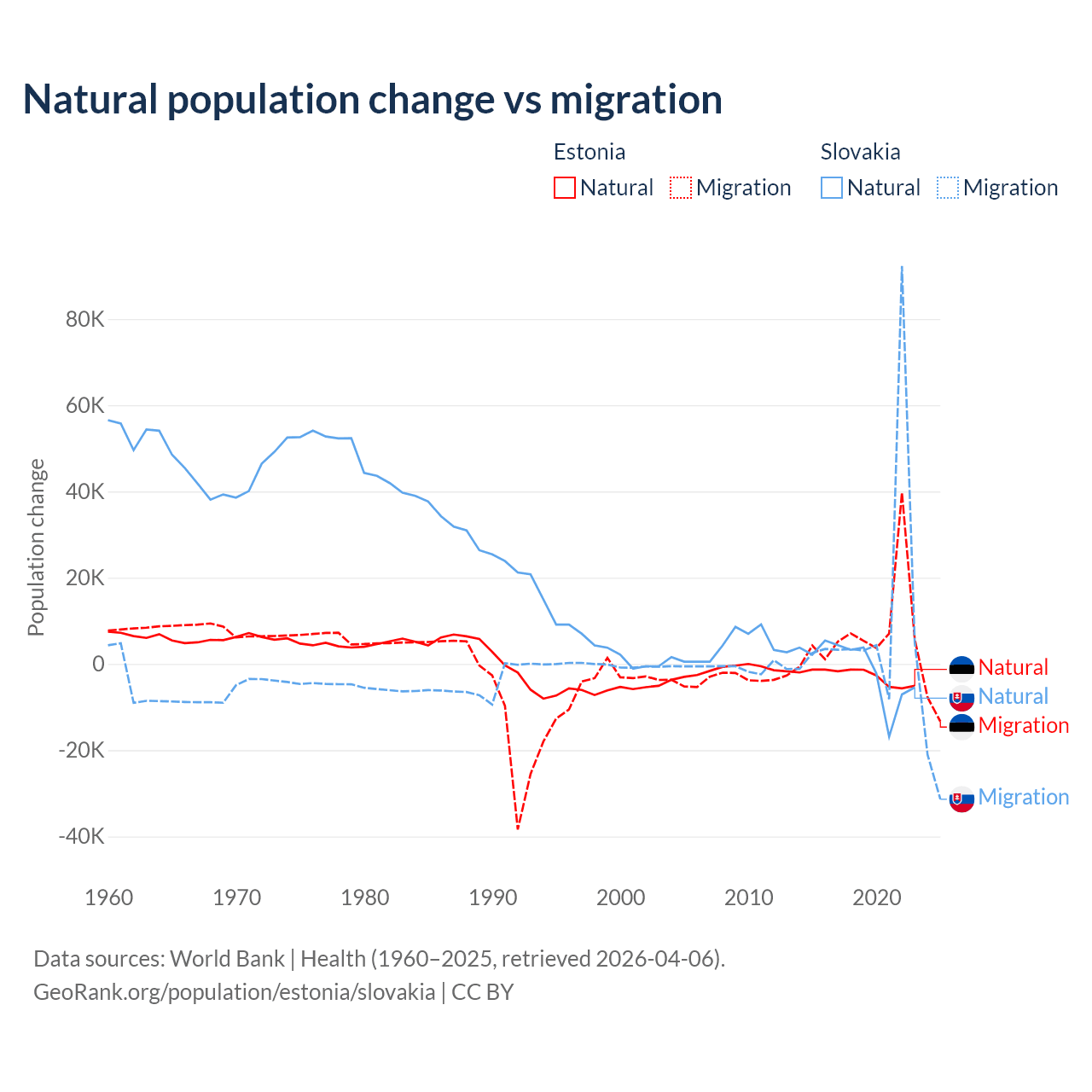Over the last 10 years, 26.1% of the population change in Estonia is from natural causes (a loss of 27,683 people) and 73.9% is from migration (a gain of 78,553 people). In Slovakia 7.47% is from natural causes (a loss of 8,728 people) and 92.5% is from migration (a gain of 108,156 people).