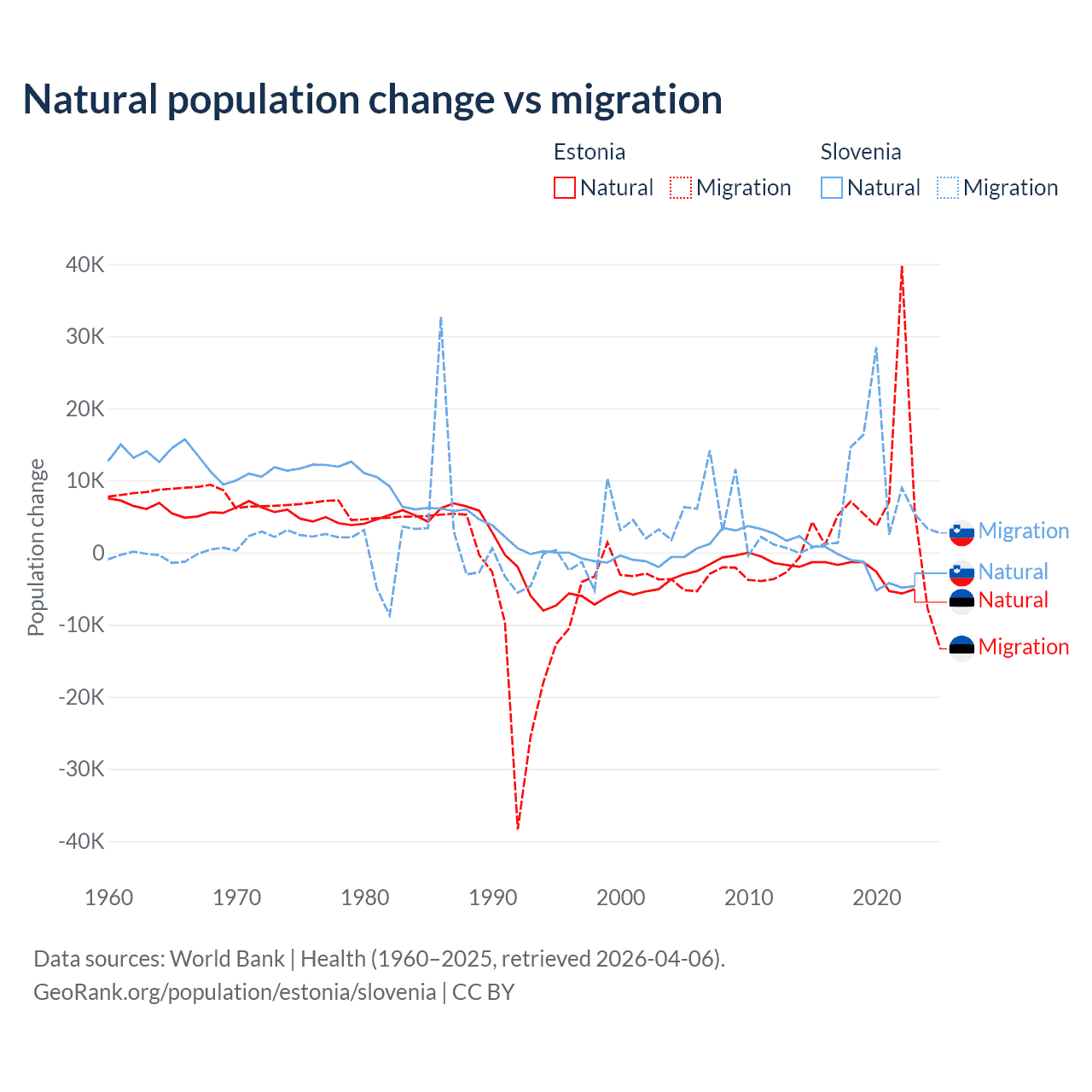 Over the last 10 years, 26.1% of the population change in Estonia is from natural causes (a loss of 27,683 people) and 73.9% is from migration (a gain of 78,553 people). In Slovenia 18.1% is from natural causes (a loss of 17,573 people) and 81.9% is from migration (a gain of 79,532 people).