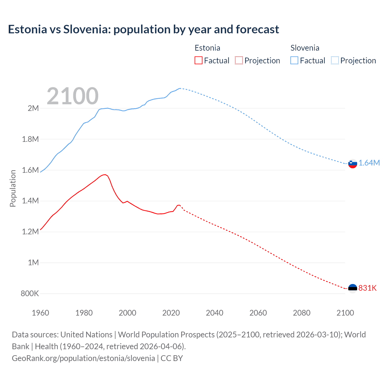 The latest officially reported population of Estonia was 1,372,341 in 2024 vs 2,127,400 people in Slovenia in 2024. In 2026, based on the adjusted UN estimation, the current Estonia's population is 1,339,590 people compared to 2,124,138 in Slovenia.