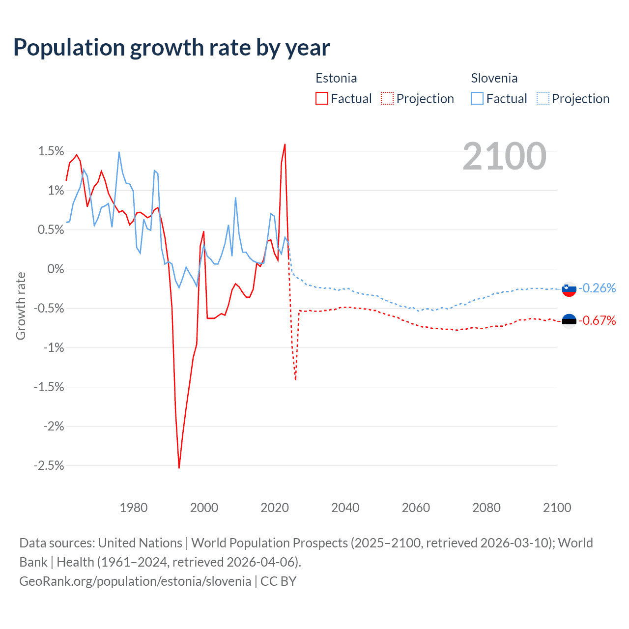 - For the last 10 years, Estonia has had an average growth rate of +0.37% per year vs +0.29% in Slovenia.