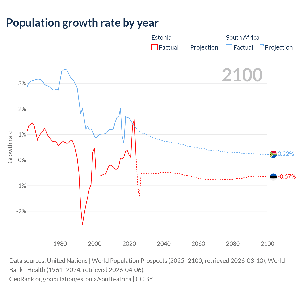 - For the last 10 years, Estonia has had an average growth rate of +0.37% per year vs +1.44% in South Africa.